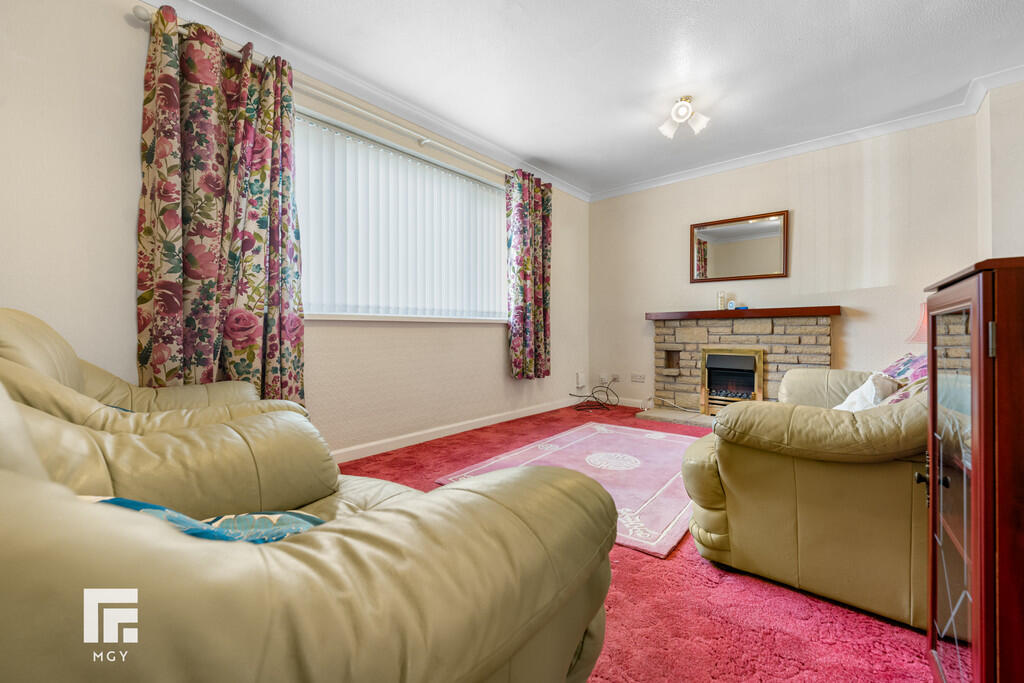 FRONTGARDEN With large area of lawn to front. Driveway with parking for approx 2 cars. Gate giving side access. Outside light.