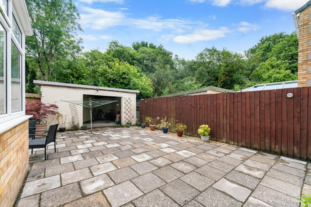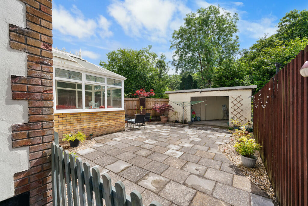 OUTSIDE Mainly paved patio with gravel borders, enclosed with boundary fence. Outside tap. Opening to garage.