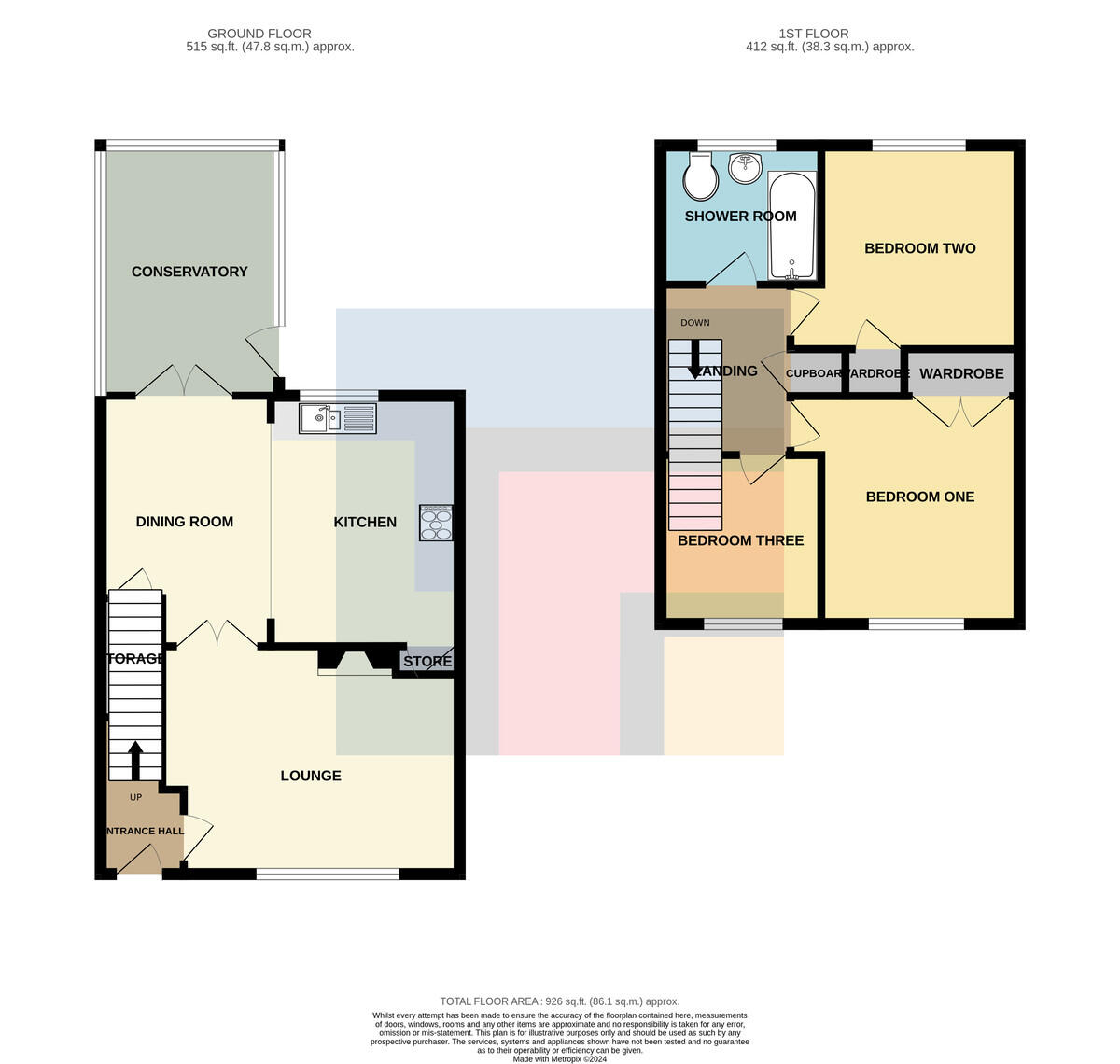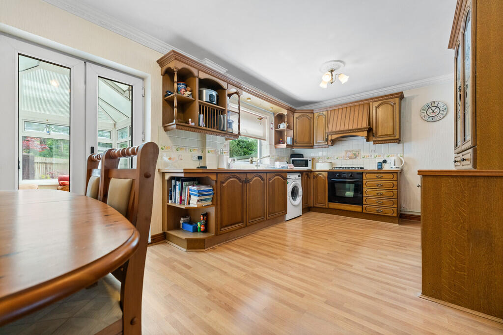 KITCHEN/DINER17' 11" x 11' 11" (5.47m x 3.65m) Fitted with a wide range of base and eye level units incorporating one and a half bowl composite sink and drainer with complementary work surfaces. Fitted gas oven and hob with extractor fan over. Integrated fridge/freezer, space for washing machine. Tiled splash backs. Laminate wood flooring. Cupboard housing gas central heating boiler with window to side. Under stair cupboard with power point. uPVC double glazed window and French patio doors to conservatory.
