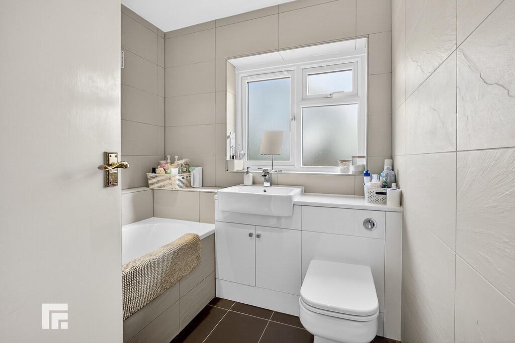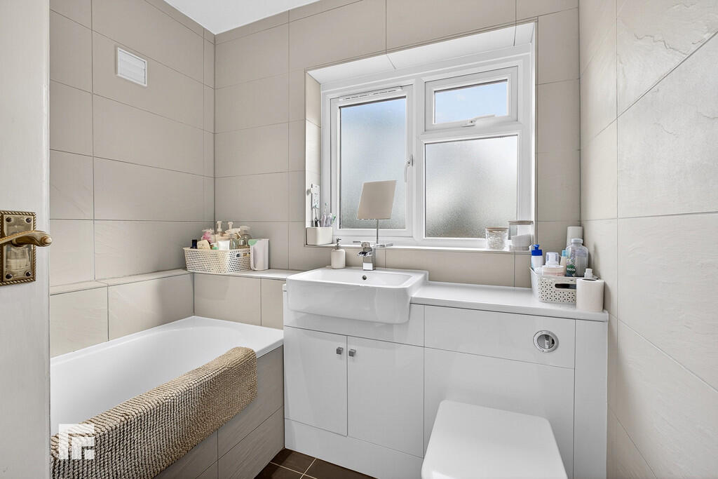 FAMILYBATHROOM6' 8" x 6' 6" (2.05m x 1.99m) Modern white suite; combined low level WC with wash hand basin, chrome mixer tap and vanity, bath with modern mixer tap and chrome shower. Glass shower screen. Heated towel rail. Extractor fan. Spotlights. Tiled walls and flooring. Obscured glass window to rear.