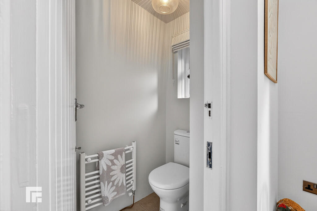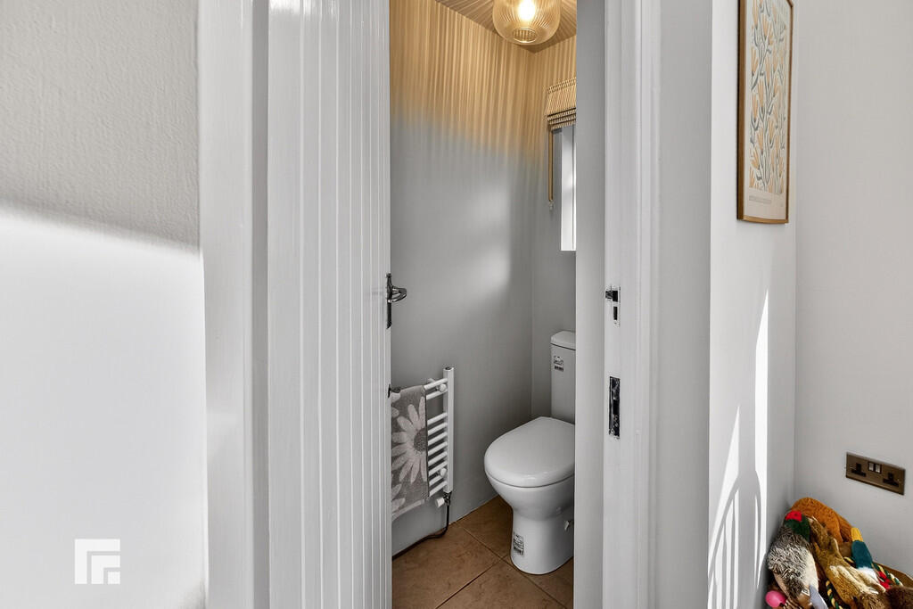 CLOAKROOM Modern white suite; low level WC. Wash hand basin with chrome mixer tap and vanity. Heated towel rail. Obscured glass window to rear.