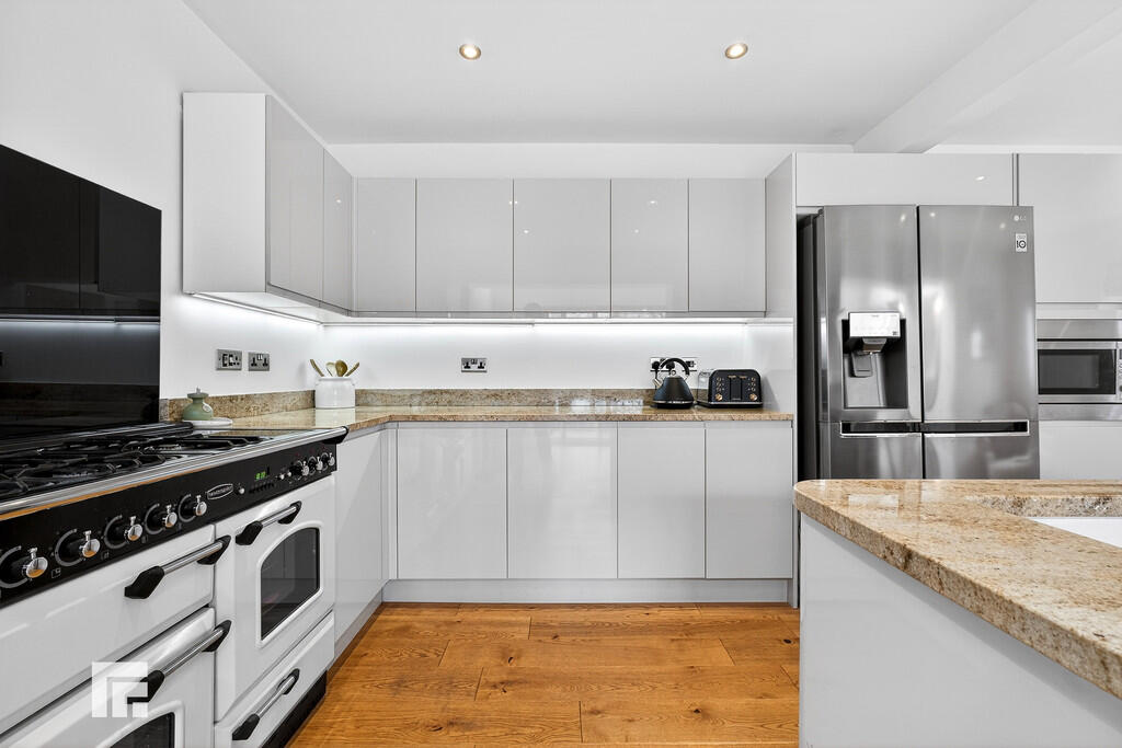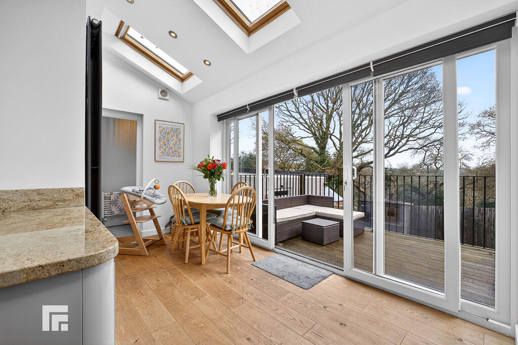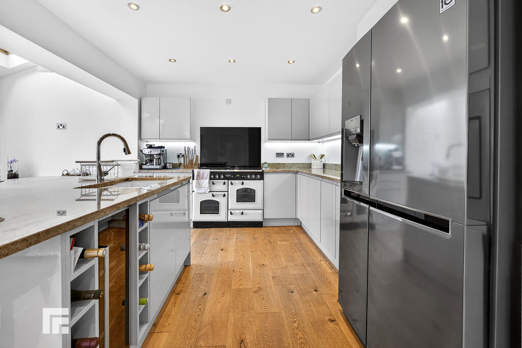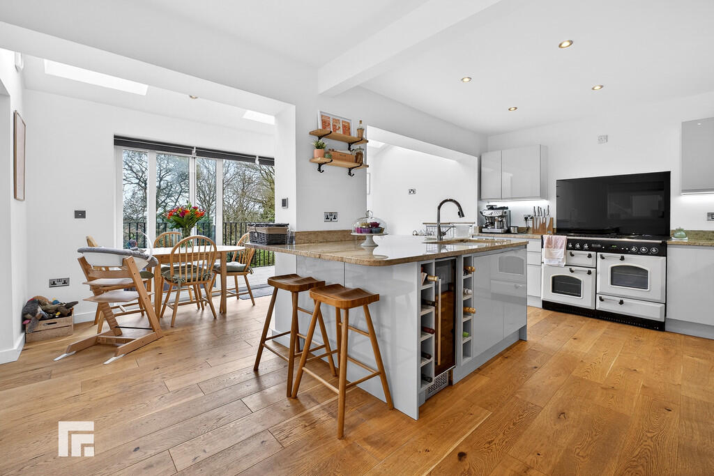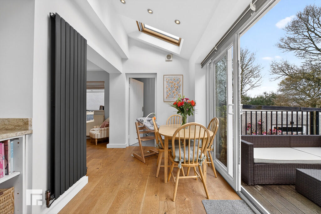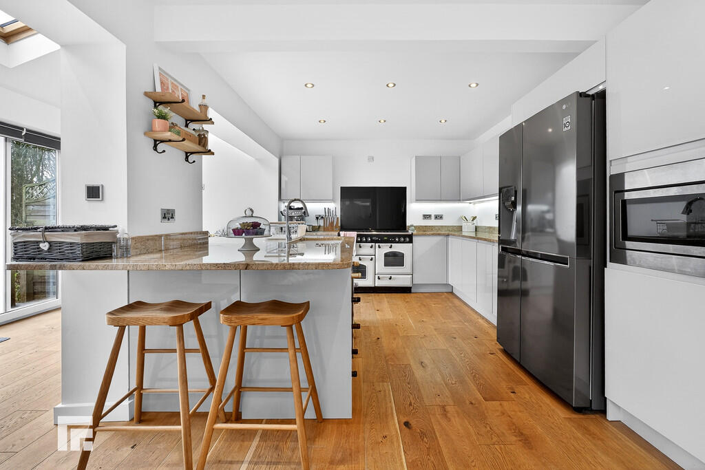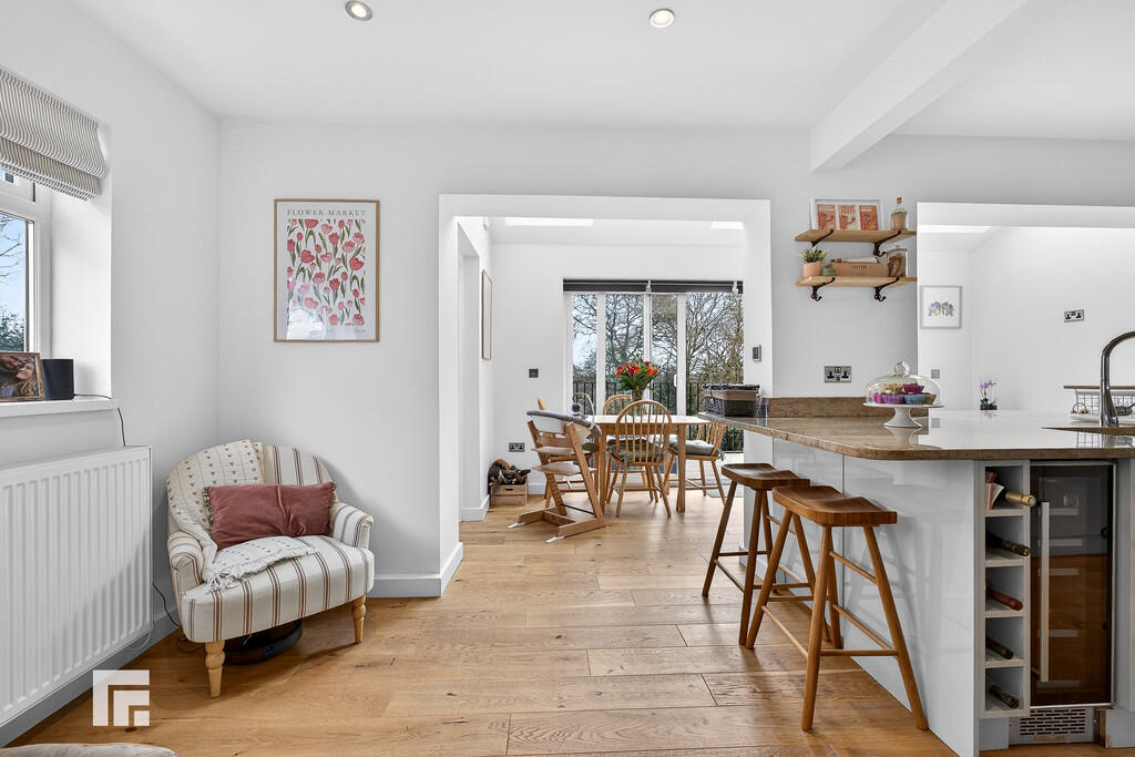 KITCHEN/DINING/FAMILYROOM20' 5" x 17' 6" (6.24m x 5.34m) An impressive extended kitchen/dining room. Appointed along two sides with large, central kitchen island, high and low level cupboards beneath granite worktops, inset double bowl ceramic sink with chrome mixer tap, 'Rangemaster' cooker. Integrated dishwasher, integrated microwave and space for American style fridge/freezer. Built in wine rack and integrated wine cooler. Cupboard housing boiler. Built in tall cupboard with plumbing for washing machine. Ample space for dining room table. Door to WC. uPVC window to side. Three Velux windows to rear. Spotlights. Radiator. Modern vertical radiator. Continuation of oak flooring. Double uPVC sliding doors opening onto raised patio area.