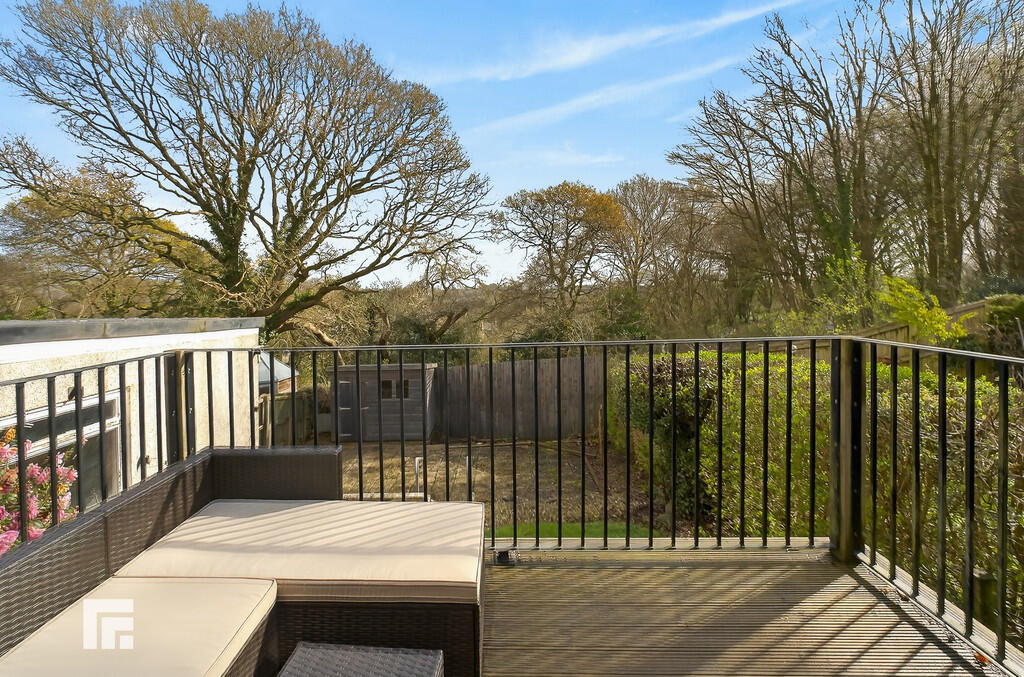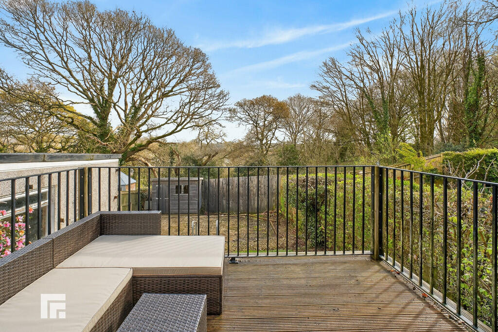 REARGARDEN Raised, decked patio area with metal balustrade looking onto woodland area. Steps leading down to a lawn area with further large, paved patio. Garden enclosed by timber fence and hedges. Timber gate to side for access.