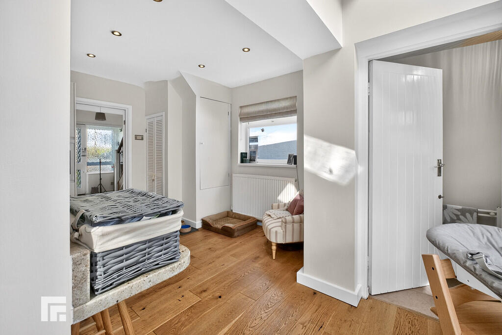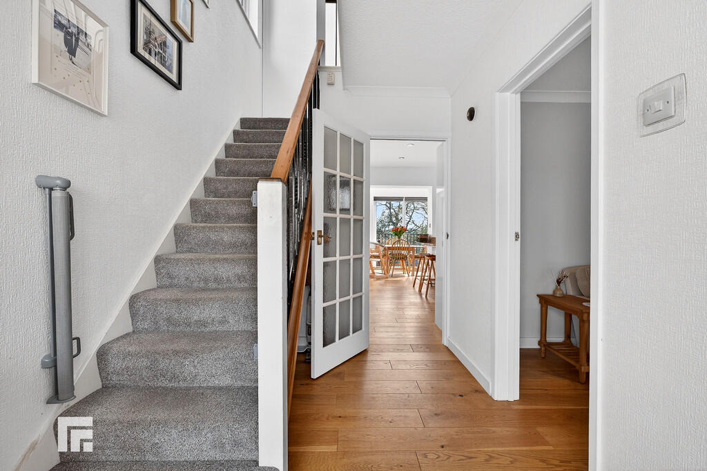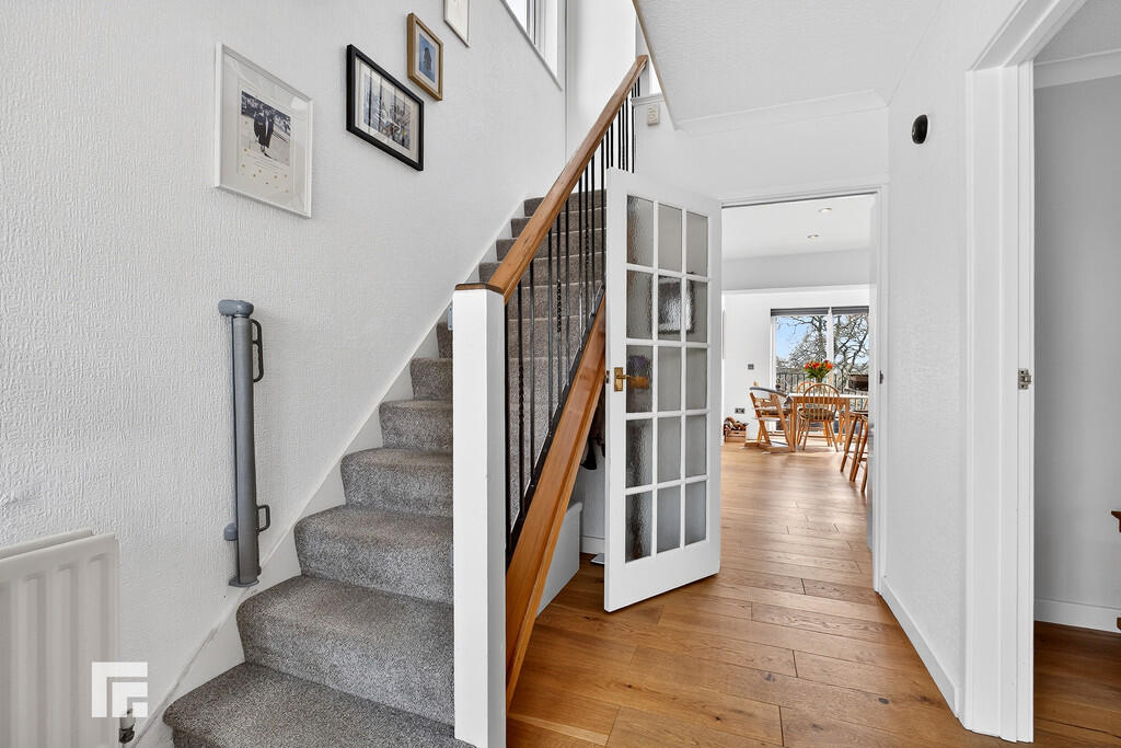 HALLWAY Entered via a wooden door with obscured glass panels, a spacious hallway. Oak flooring. Radiator. Doors to all rooms. Staircase with black spindles and wooden hand rail leading to first floor.