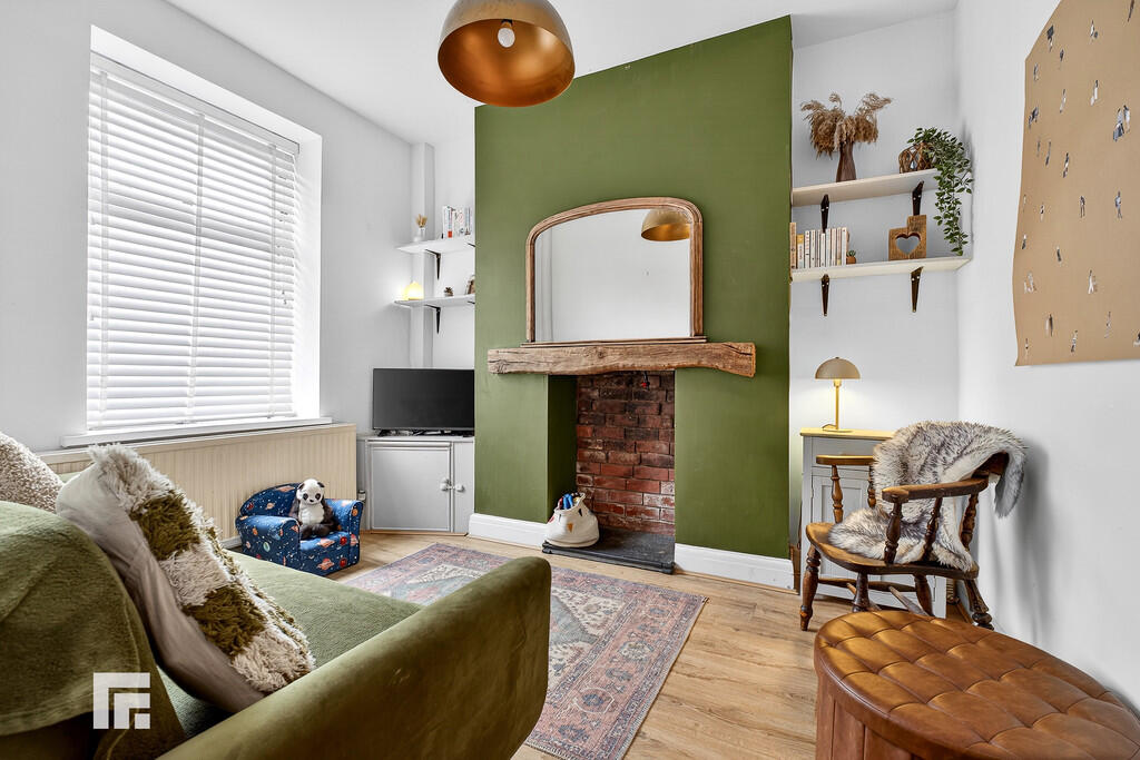 LOUNGE11' 2" x 8' 4" (3.42m x 2.56m) A cosy lounge with exposed brick chimney stack and rustic wooden lintel mantle. Two radiators. Quality wood effect laminate flooring. uPVC window to front.