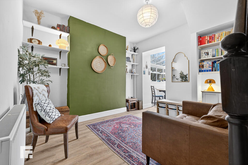 SITTINGROOM13' 3" x 11' 11" (4.06m x 3.64m) A well presented second reception room. Radiator. Quality wood effect laminate flooring. Spindled, painted staircase with exposed brick wall. Opening to kitchen. Original feature arch through to hallway area.