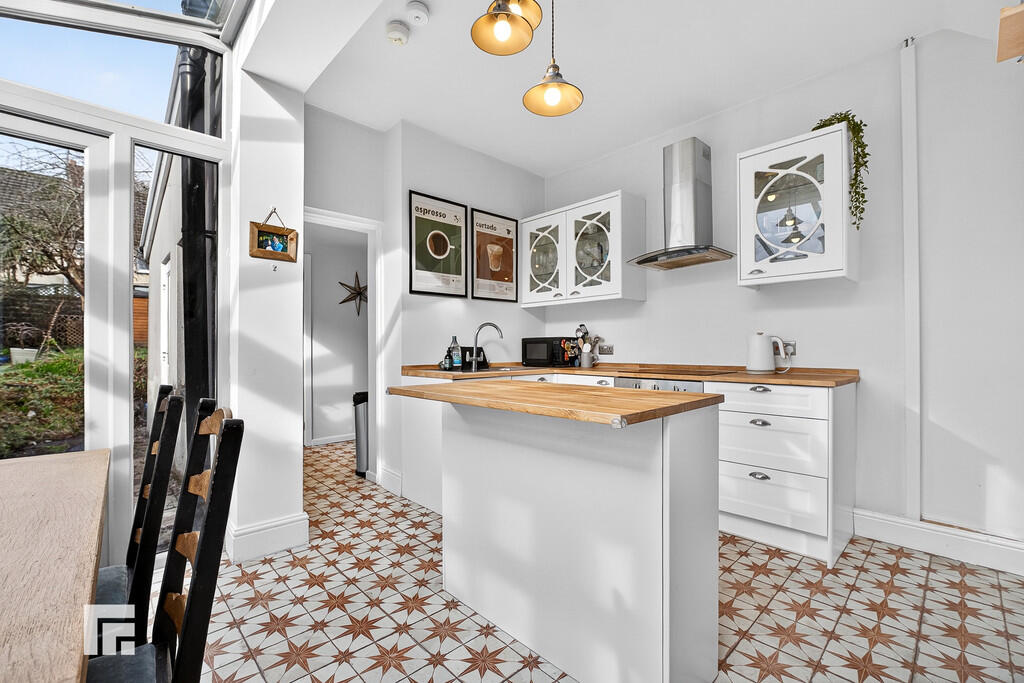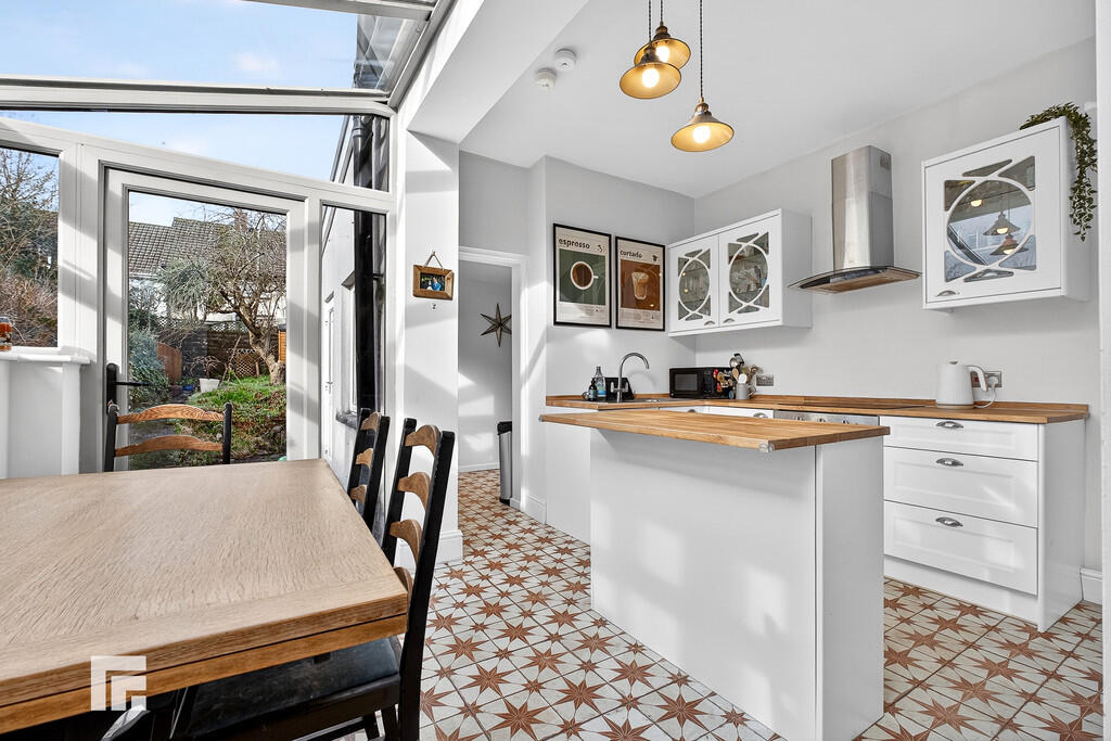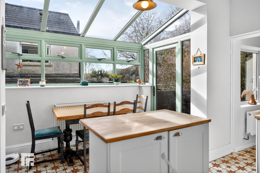 KITCHEN13' 5" x 11' 0" (4.10m x 3.37m) Appointed along two sides, high and low level shaker style cupboards beneath solid oak worktops, stainless steel sink with chrome mixer tap and side drainer, integrated four ring induction hob, integrated single oven and integrated slimline dishwasher. Space for fridge freezer. Island with low level cupboards and solid oak work surface. Built in pantry cupboard. Radiator. Patterned tiled flooring. Ample space for dining room table. Part glass roof with sage framework. Windows to side. Single door with window to side opening into the rear garden. Opening through to boot room.