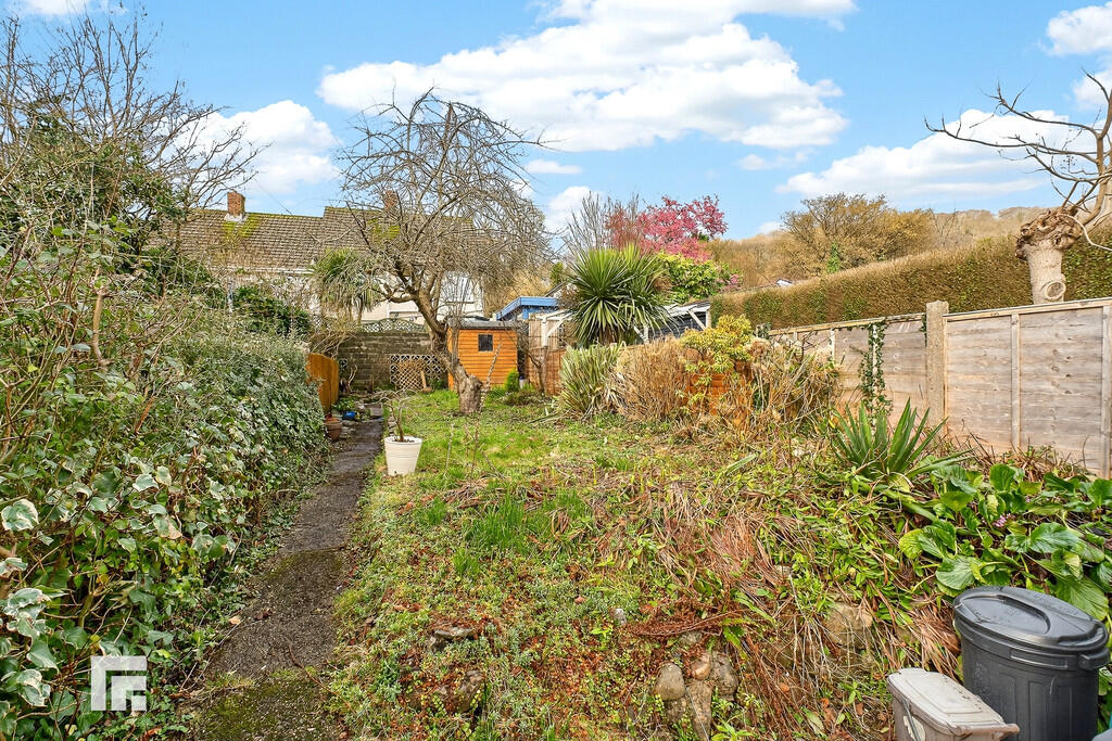 REARGARDEN Paved patio area with pathway leading to a large area of lawn. Mature plants and shrubs. Timber storage shed. Enclosed by timber fence and stone wall. Outside tap.