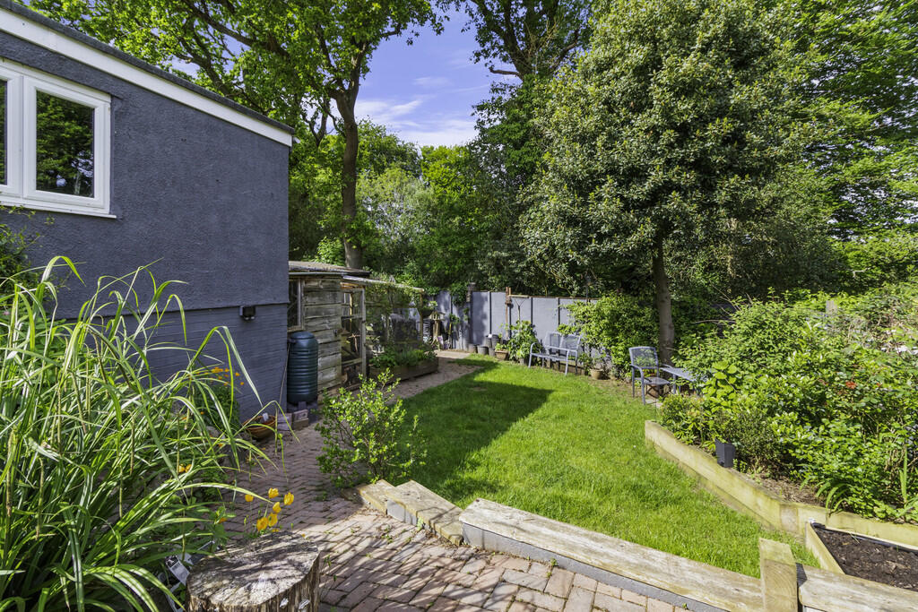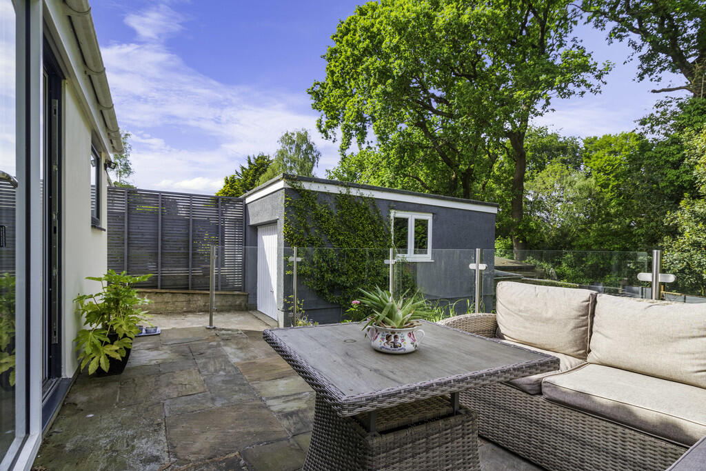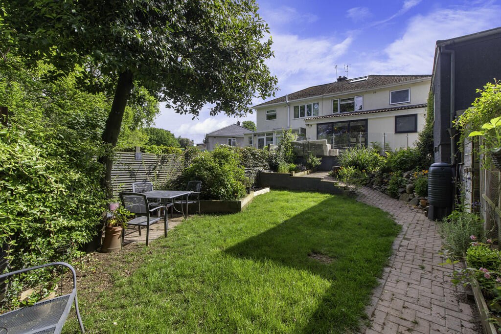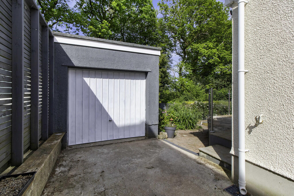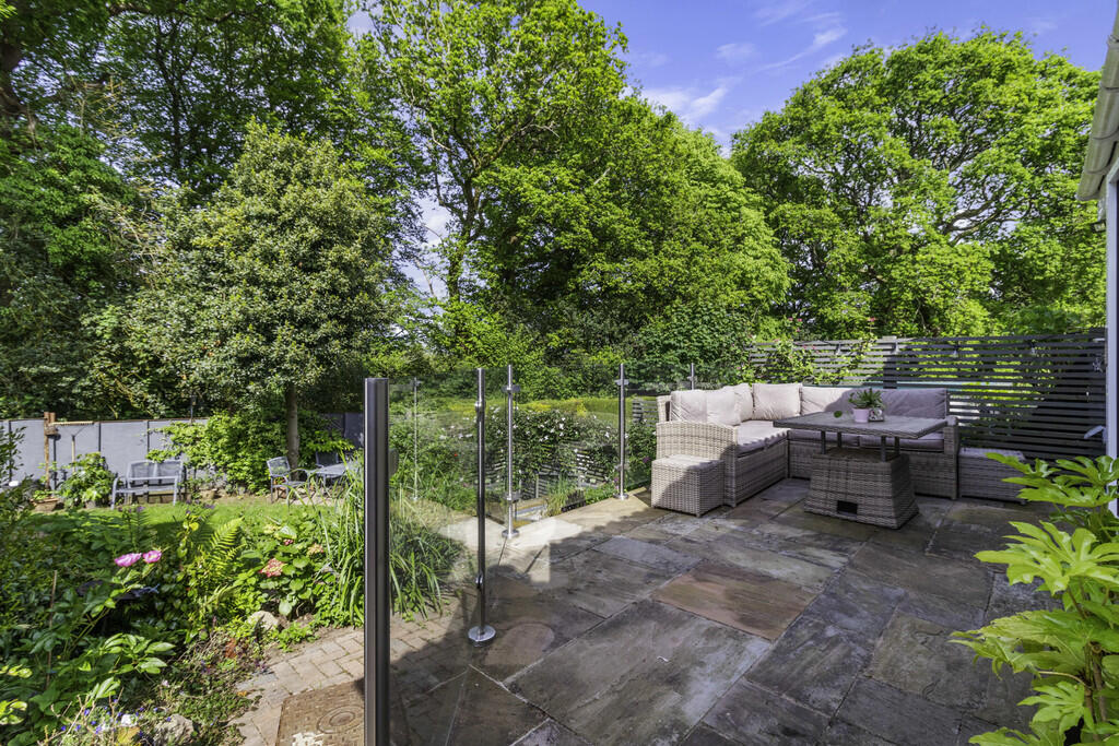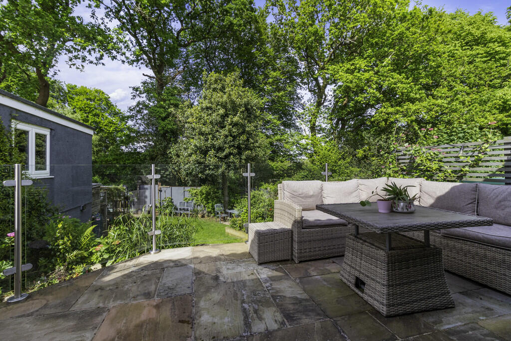 REARGARDEN Delightful paved patio with glass balustrade. Keyblock paved pathway with beds of plants and shrubs leading to an area of lawn. Rear keyblock paved patio. Enclosed by timber fencing. Backing onto woodland. Timber storage shed. Outside lighting. Outside power point.
