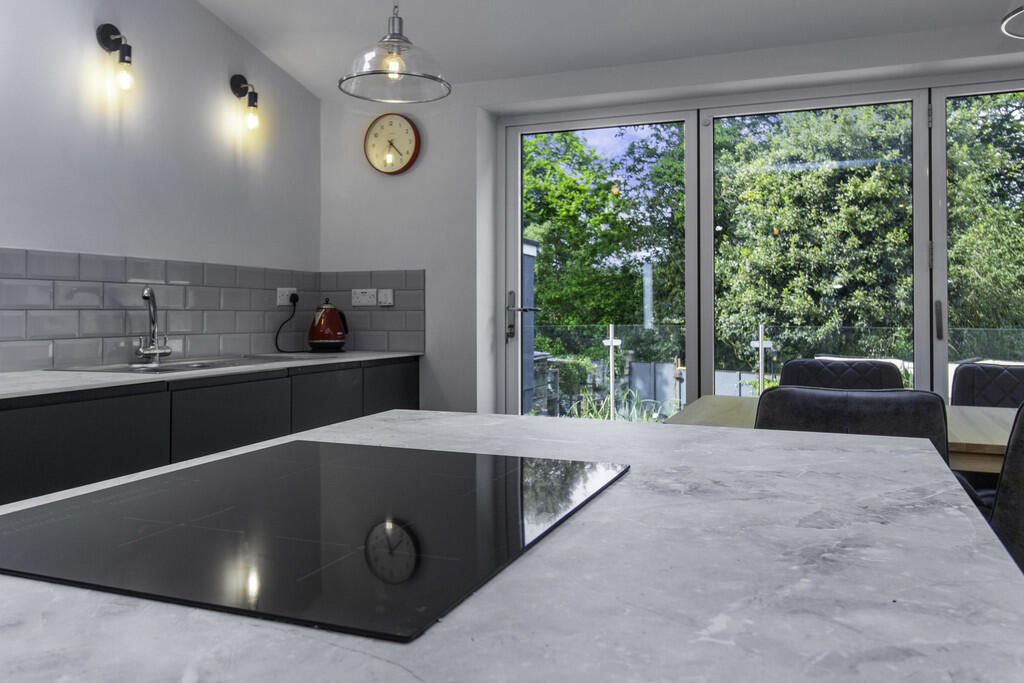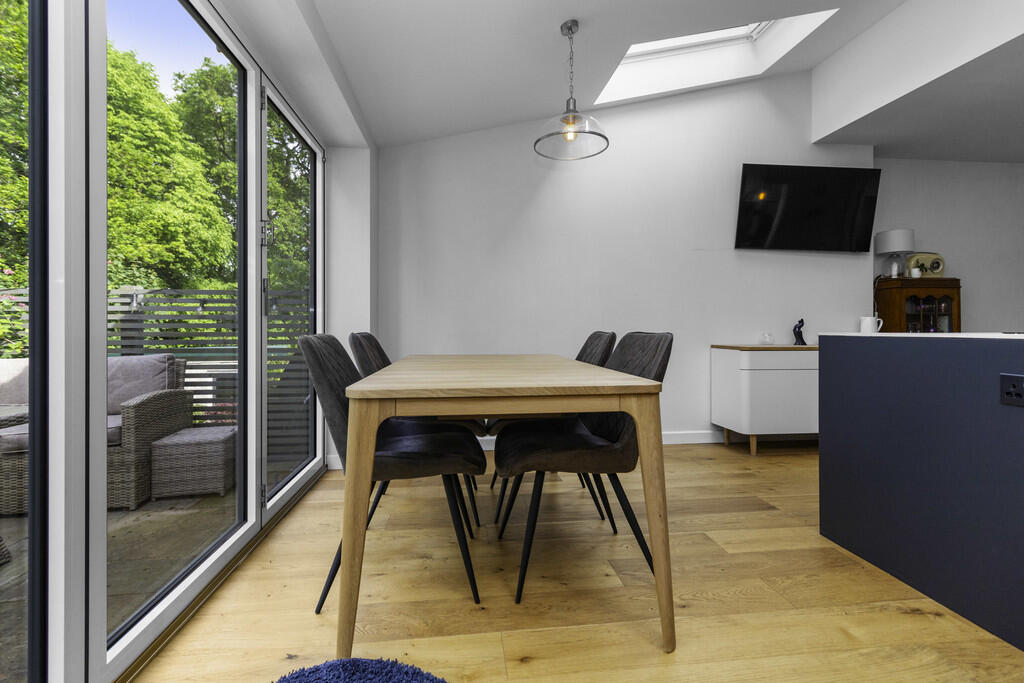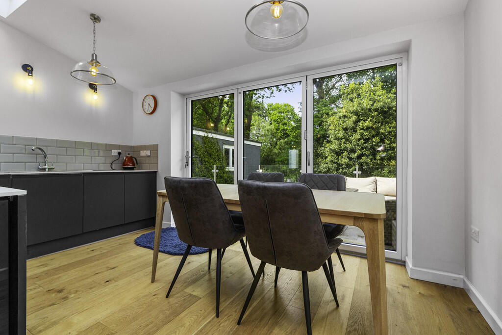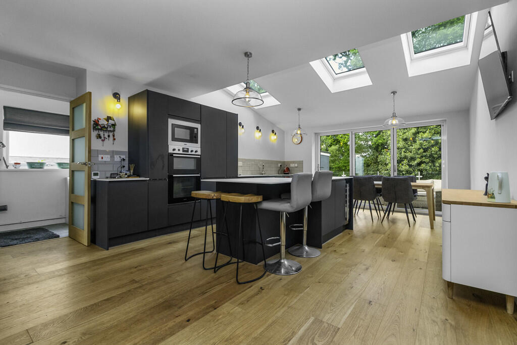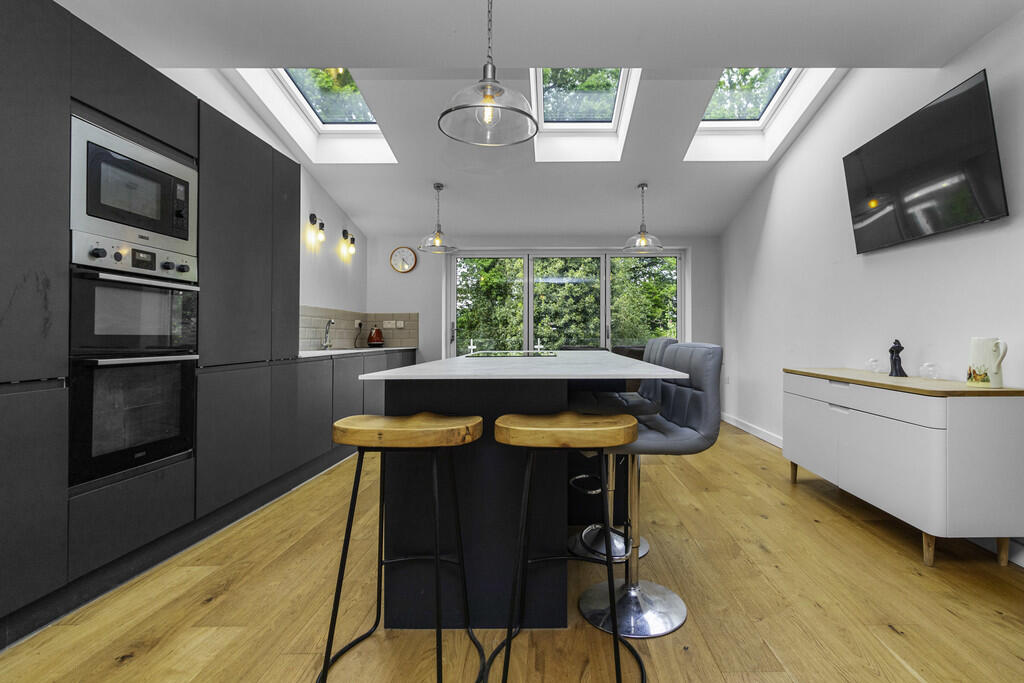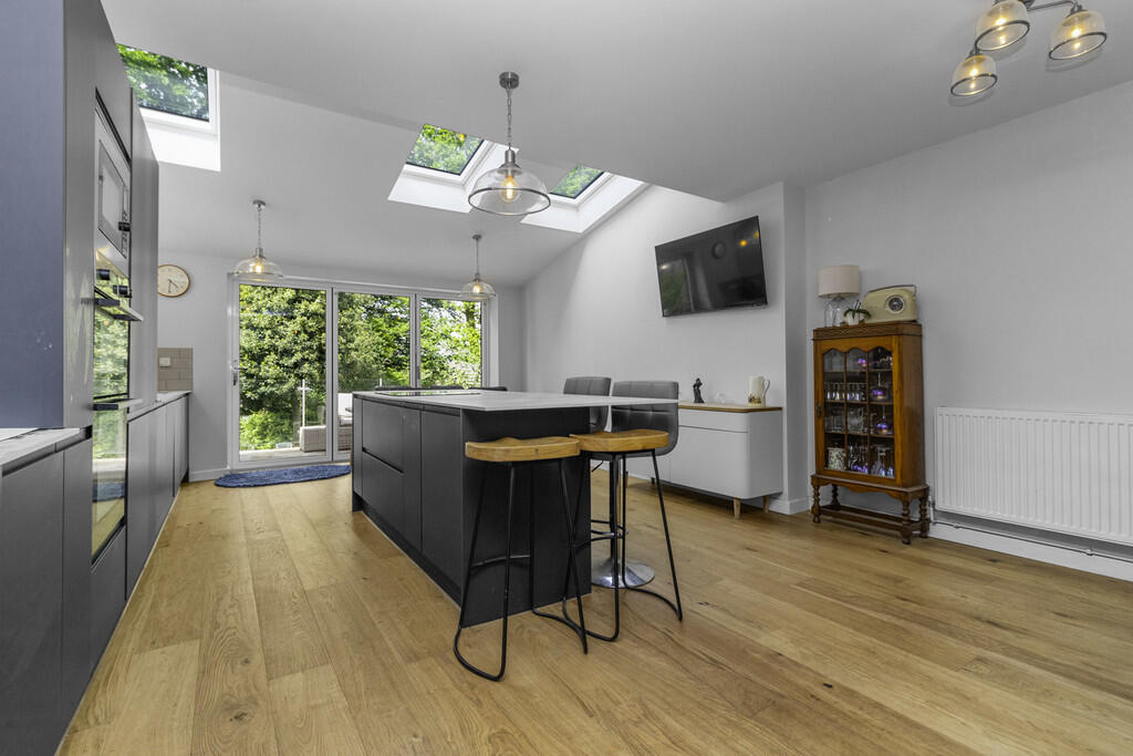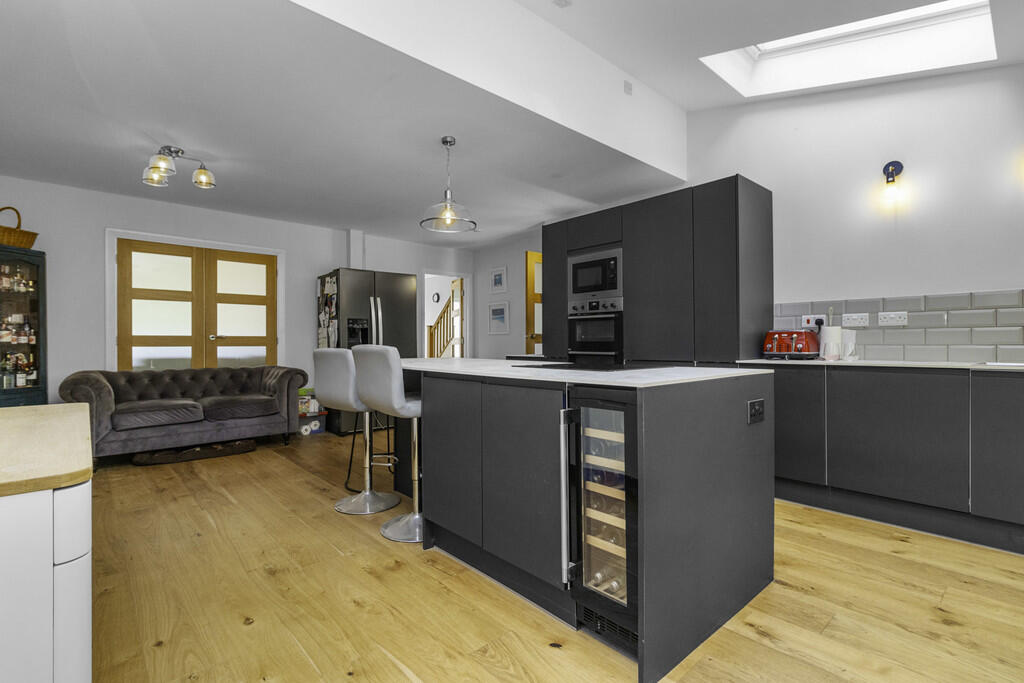 KITCHEN/DINING/FAMILYROOM23' 3" x 16' 6" (7.11m x 5.04m) An exceptional, open-plan kitchen/dining/family room fitted with a wide range of modern base and full height pantry style units incorporating one and a half bowl stainless steel sink and drainer with complementary work surfaces. Integrated electric double oven, microwave and dishwasher. Space for American fridge/freezer. The central island includes induction hob, fitted base units with complementary work surfaces and breakfast bar. Space for wine fridge. Tiled splash backs. Radiator. Oak wood flooring with underfloor heating (to the extension). Feature three double glazed bi-fold doors to rear garden with beautiful outlook. Three double glazed velux windows to rear. Door to utility room.