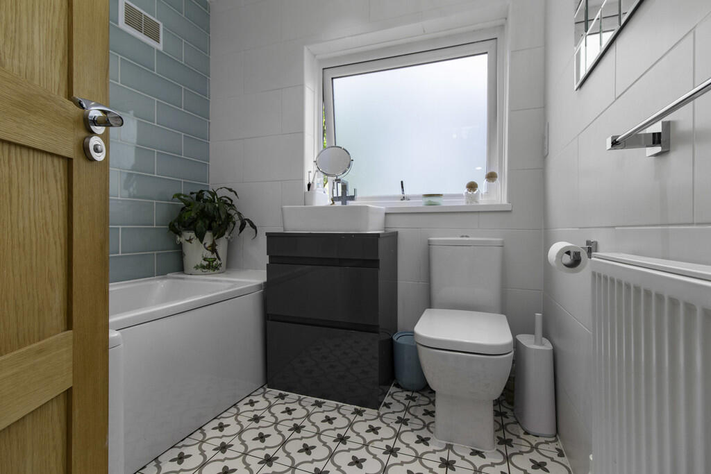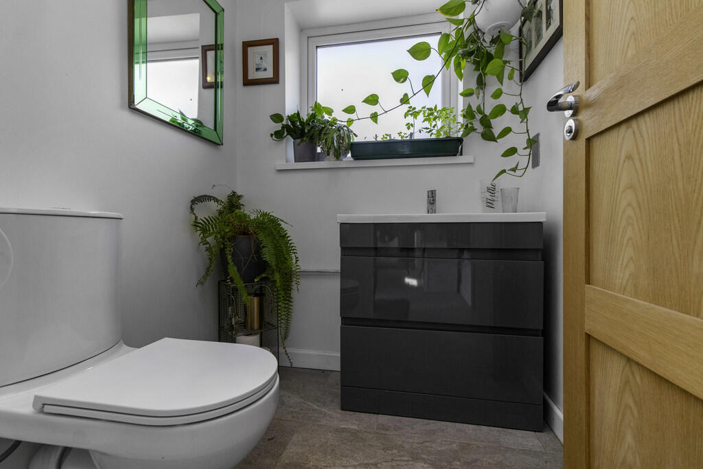 CLOAKROOM Quality white suite comprising low level wc, vanity wash basin with storage below. Obscured glass window to rear. Tiled flooring. Chrome heated towel rail. Underfloor heating