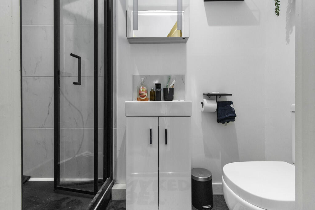 ENSUITESHOWERROOM Quality white suite comprising low level wc, vanity wash basin with storage below, shower cubicle with black frame enclosure and black shower. Tiled splash back. Extractor fan.