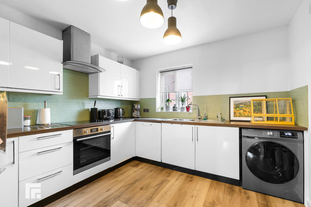 KITCHEN11' 3" x 10' 8" (3.43m x 3.25m) Laminate flooring. Modern fitted white gloss kitchen with worktops over incorporating stainless steel sink and drainer with mixer tap over and four ring electric hob with extractor hood above and oven beneath. Tiled splashback. Integrated dishwasher. Space for appliances such as washing machine and fridge/freezer. Pendant light fitting. Power points. Double glazed uPVC window to front aspect. Door to :-