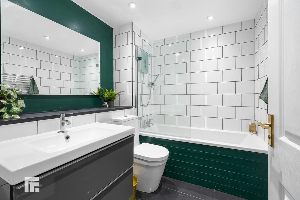 BATHROOM7' 8" x 6' 7" (2.34m x 2.01m) Tiled flooring and walls. Spotlights. Three-piece-suite comprising vanity wash hand basin with mixer tap over, WC, and panelled bath with hot and cold tap over and mains powered shower above. Extractor.