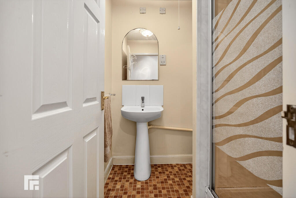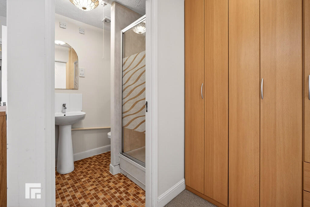 ENSUITE5' 1" x 5' 8" (1.57m x 1.75m) Shower cubicle with electric shower over. Pedestal wash hand basin with mixer tap over and wall mounted mirrored mirror. W.C. Shaver point. Vinyl flooring. Wall mounted vanity cupboard. Extractor fan.