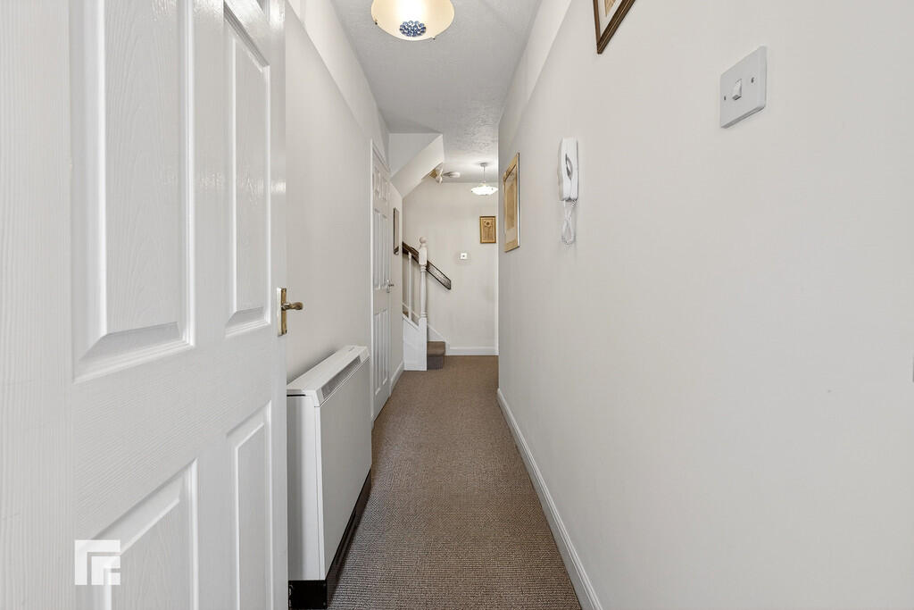 PORCH/ENTRANCEHALL Entered via wooden door, with security spy hole. Double glazed uPVC window to front aspect. Carpeted flooring. Porch area, with additional door leading to hallway. Wall mounted storage heater. Door to storage cupboard. Wall mounted intercom. Stairs rising to first floor.