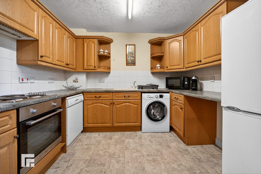 KITCHEN10' 0" x 8' 5" (3.05m x 2.59m) Large separate kitchen. Vinyl flooring. Part tiled walls. Fitted base and wall units across three walls, with work surfaces incorporating inset double sink and drainer with mixer tap over. Integrated oven, four ring electric hob and extractor over. Space for washing machine, dish washer and fridge freezer.
