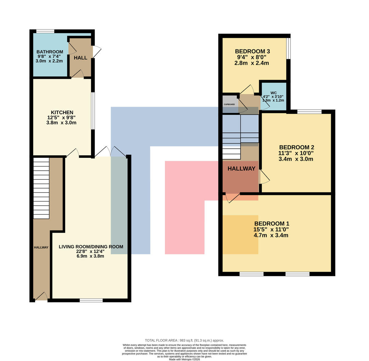 CLOAKROOM4' 2" x 3' 9" (1.29m x 1.15m) Low level WC and wash hand basin. Fitted storage cupboard. Laminate wood flooring. Worcester gas combination boiler. Fully tiled walls.
