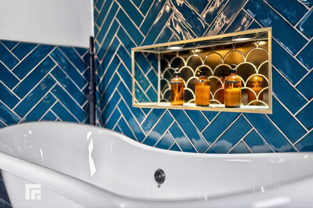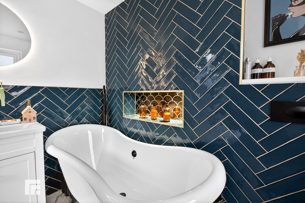 BATHROOM8' 7" x 7' 3" (2.62m x 2.22m) A stunning new bathroom suite to include low level WC, vanity enclosed wash hand basin, roll top free-standing bath, and shower cubicle. Modern tiled flooring with underfloor heating. Tiled splash backs. Ladder radiator. Extracting fan. uPVC double glazed window to side. LED mirror. Spotlights.