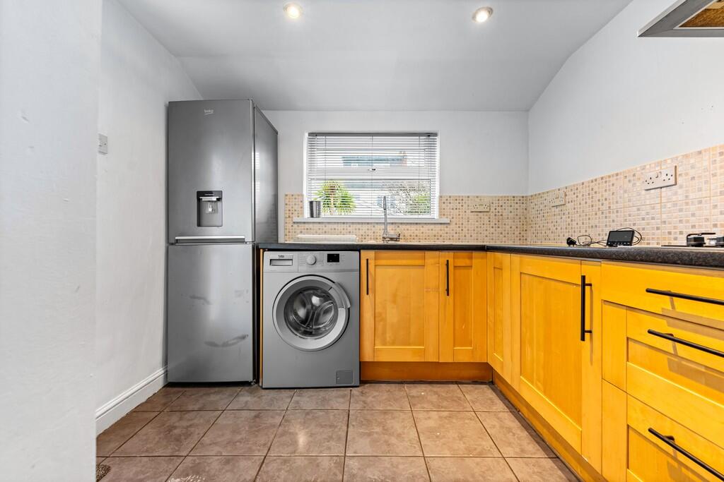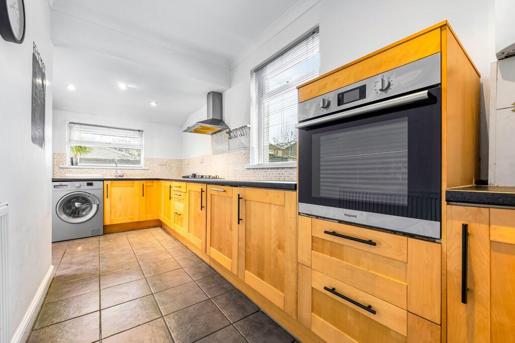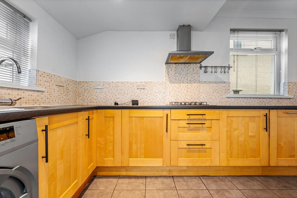 KITCHEN17' 0" x 8' 8" (5.19m x 2.66m) Tiled flooring. Fitted kitchen with a range of wall, base and drawer units with worktops over incorporating four ring gas hob with extractor above, and stainless steel 1.5 sink and drainer with mixer tap over. Space for appliances such as fridge/freezer and washing machine. Tiled splashback. Integrated dishwasher and oven. Power points. Two double glazed windows - one to side aspect and the other to rear. Wall mounted boiler. Glazed door providing access to rear garden. Spotlights. Radiator.