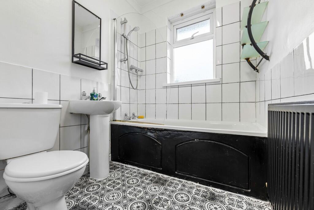 BATHROOM6' 2" x 5' 7" (1.88m x 1.72m) Vinyl flooring. Partially tiled walls. White three-piece-suite comprising WC, pedestal wash hand basin with hot and cold tap over and panelled bath with hot and cold tap over and mains powered shower above. Radiator. Obscure window to front aspect. Pendant light fitting.