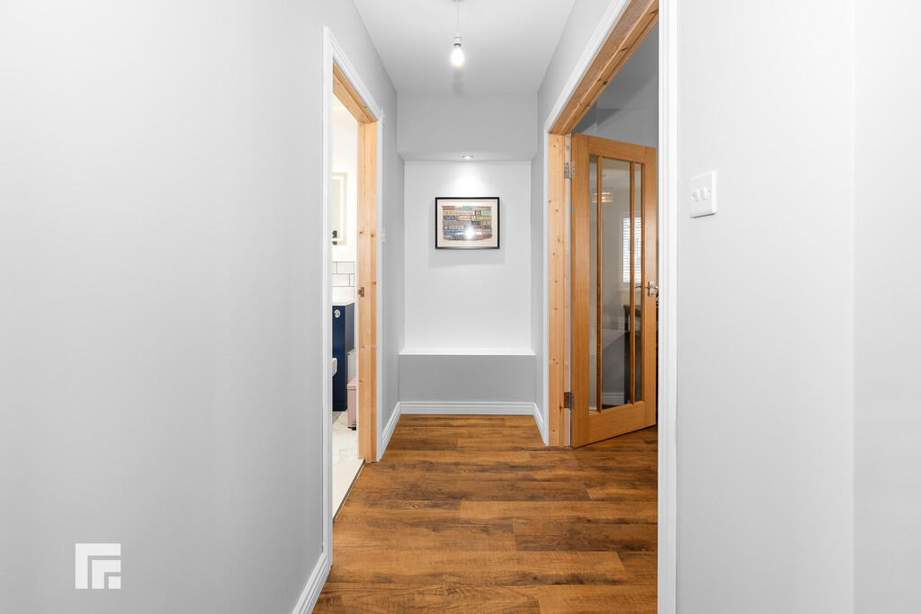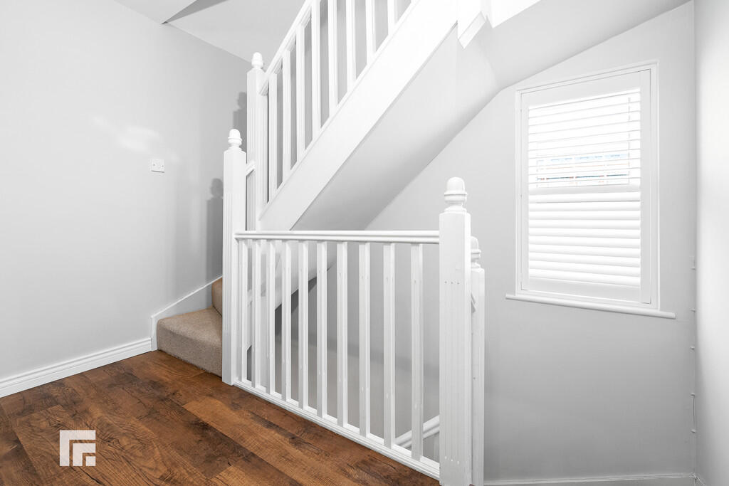 FIRSTFLOOR Carpet to stairs. Laminate flooring to landing. Double glazed uPVC window to side aspect. Pendant light fitting and additional spotlight. Doors to one bedroom, bathroom and lounge. Stairs rising to second floor.
