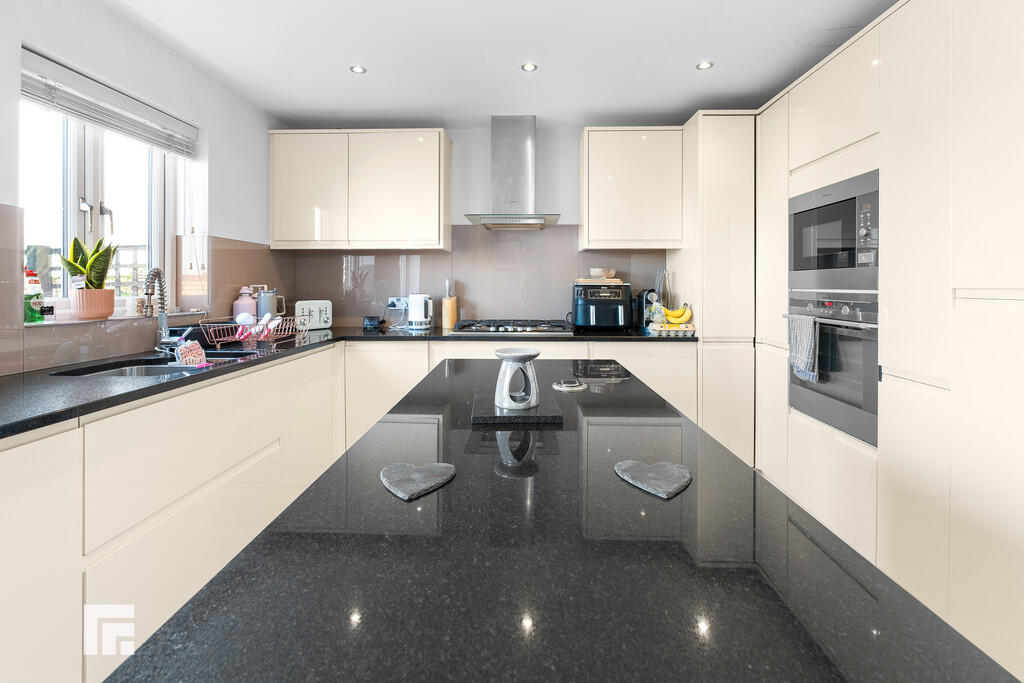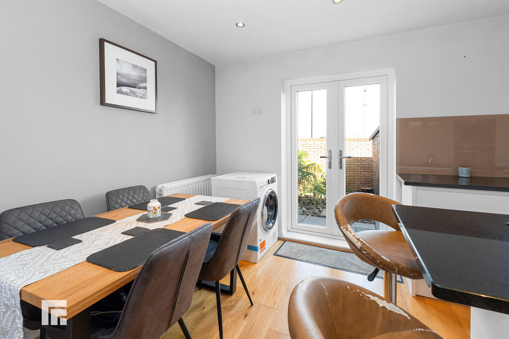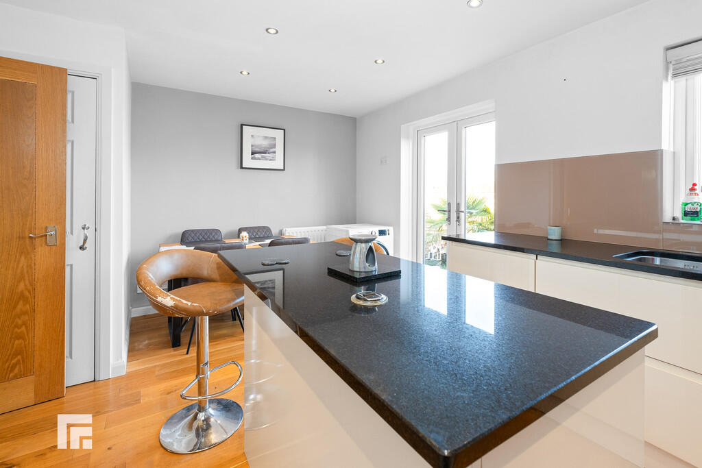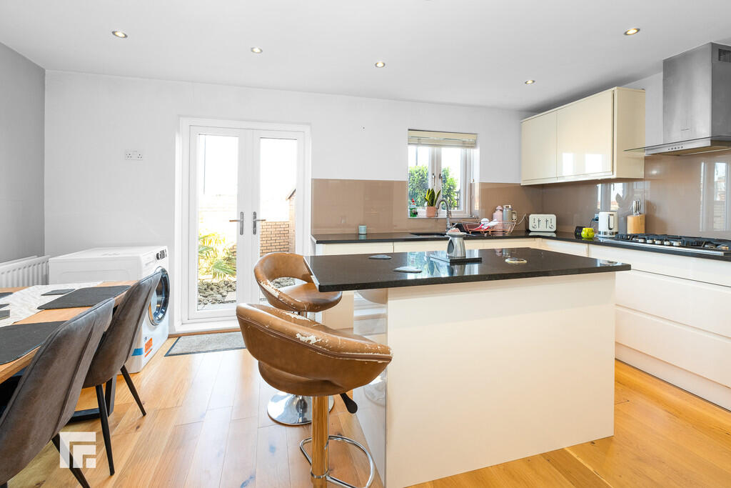 KITCHEN/BREAKFASTROOM16' 4" x 11' 9" (4.98m x 3.60m) Laminate flooring. Modern fitted kitchen with a range of wall, base and drawer units with worktops over incorporating stainless steel sink and drainer with mixer tap over and five ring gas hob with stainless steel extractor hood over. Integrated 'NEFF' appliances such as oven, microwave, fridge/freezer and washing machine. Central island with granite worktop and flush fitting pop up power socket. Wine cooler and storage beneath. Space for stool seating. Additional under stair storage cupboard. Power points. Spotlights to ceiling. Double glazed uPVC window to rear aspect. Double glazed uPVC French doors leading to rear garden. Radiator.