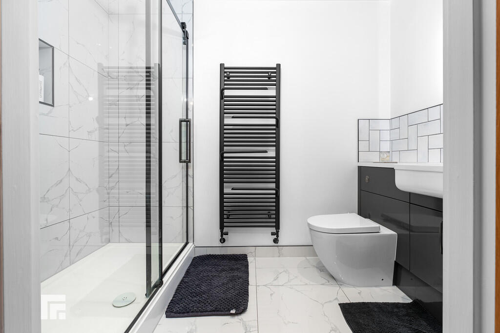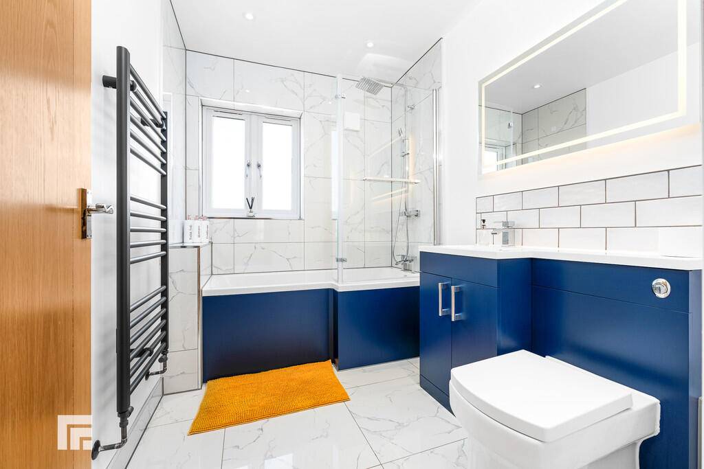 BATHROOM6' 2" x 8' 5" (1.90m x 2.59m) Newly refurbished. Marble effect tiled flooring with partially tiled walls. LED touch screen mirror. WC. Vanity wash hand basin with mixer tap over and storage beneath. Tiled splashback. Panelled bath with hot and cold tap over and mains powered shower above with additional handheld shower attachment. Spotlights. Double glazed uPVC obscure window to rear aspect. Heated towel rail.