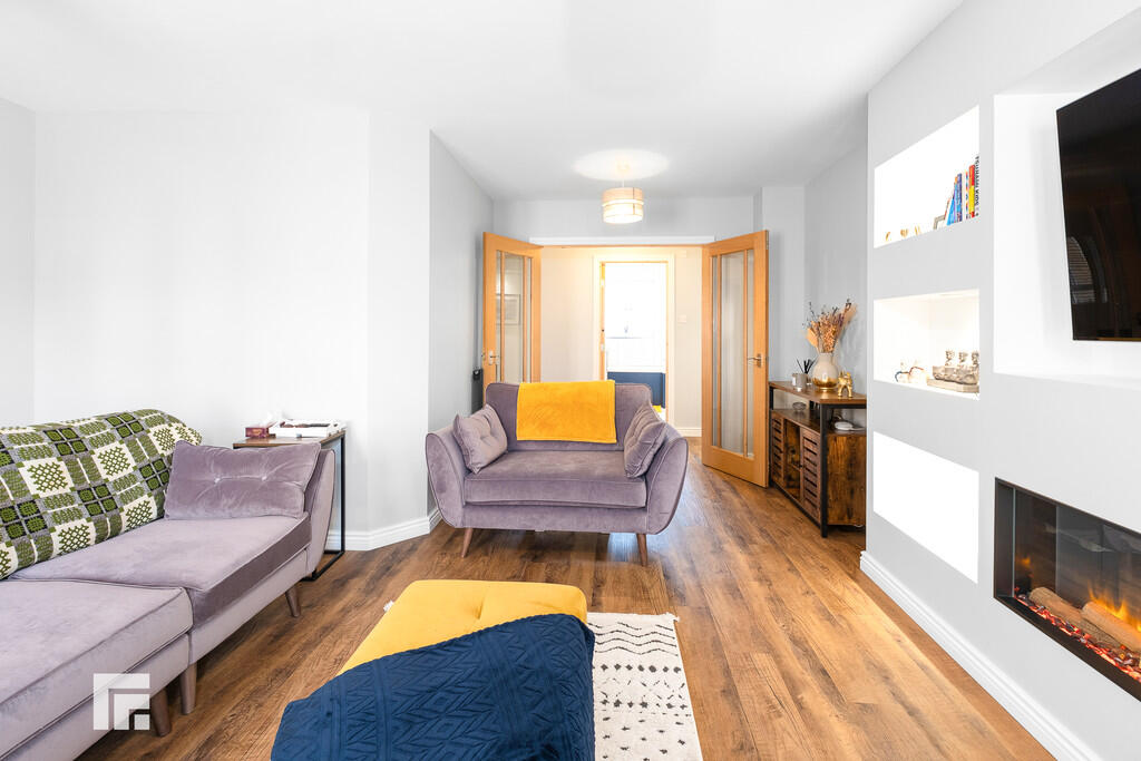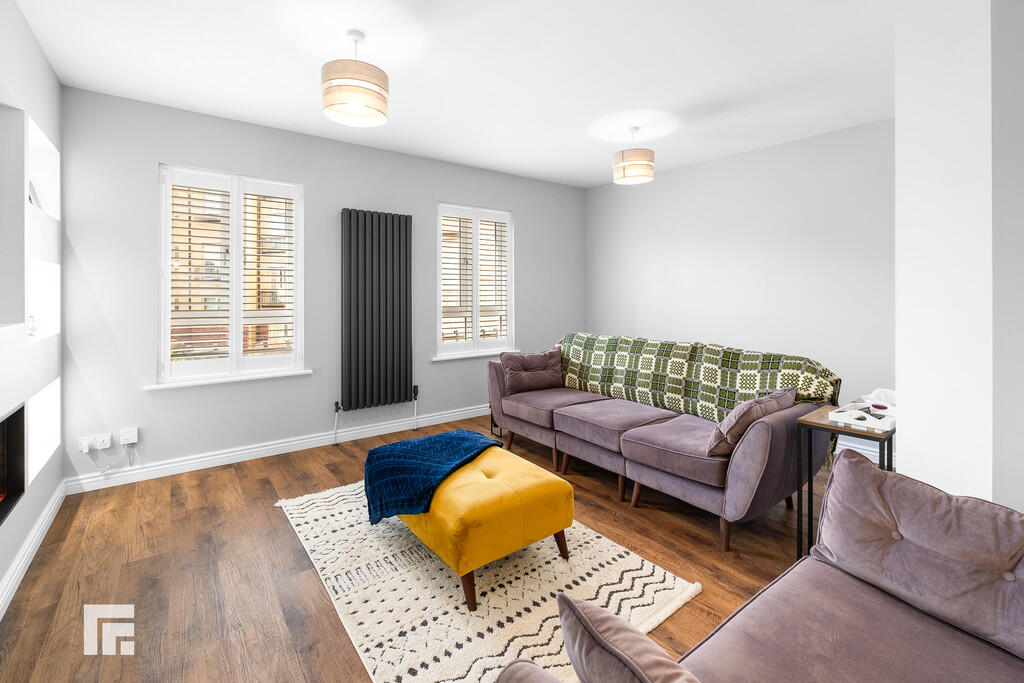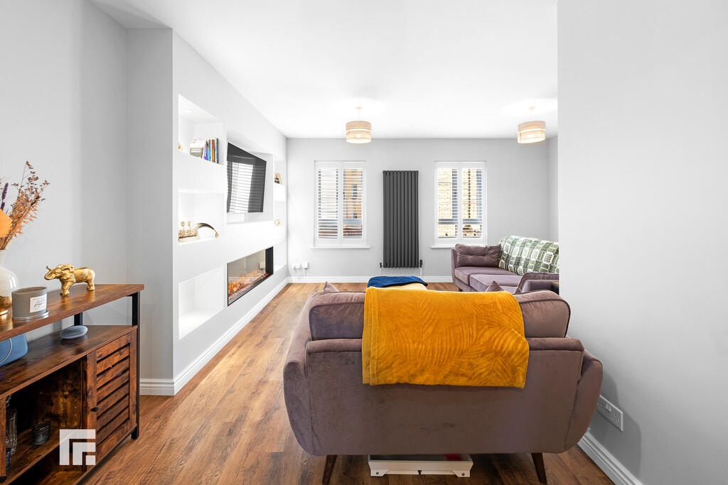 LOUNGE17' 1" x 15' 7" (5.23m x 4.76m) Laminate flooring. Two pendant light fittings. Two radiators. Two double glazed uPVC windows to front aspect with fitted shutter blinds. Power points. Media wall with inset electric fire and storage with spotlights above.