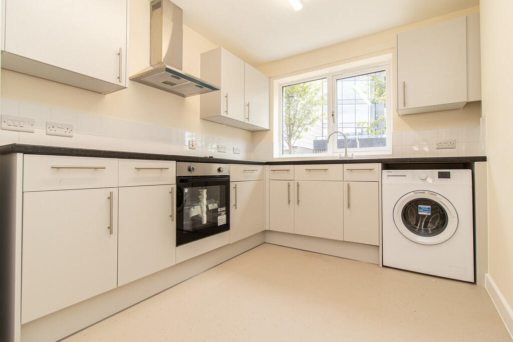 KITCHEN11' 1" x 7' 9" (3.40m x 2.37m) Vinyl flooring. LED strip light. Modern fitted kitchen with a range of wall, base and drawer units with worktops over incorporating stainless steel sink and drainer with mixer tap over and electric hob with extractor above and oven beneath. Tiled splashback. Space and plumbing for washing machine. Space for fridge/freezer. Power points. Double glazed uPVC window to front aspect. Door leading to large storage cupboard, which houses the hot water tank.