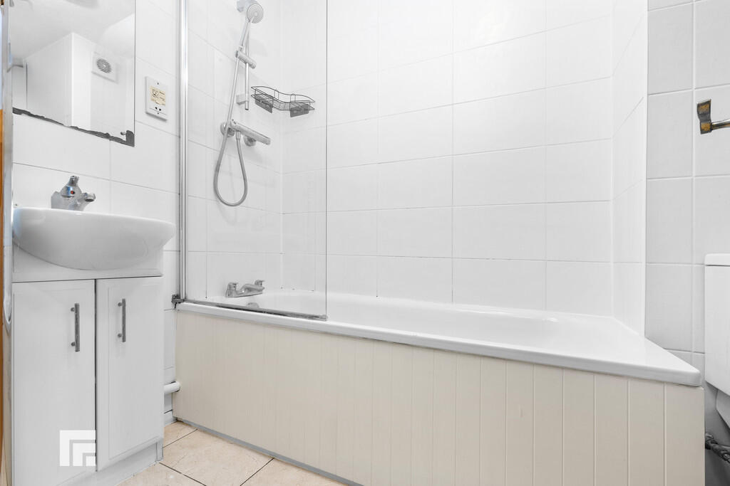 BATHROOM4' 11" x 7' 6" (1.50m x 2.29m) Tiled walls and flooring. White three-piece-suite comprising vanity wash hand basin with mixer tap over and storage beneath, WC, and panelled bath with hot and cold tap over and mains powered shower above. Extractor fan. Shaver point. Chrome heated towel rail.