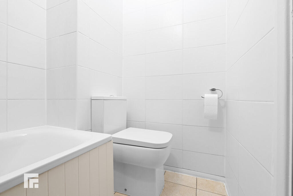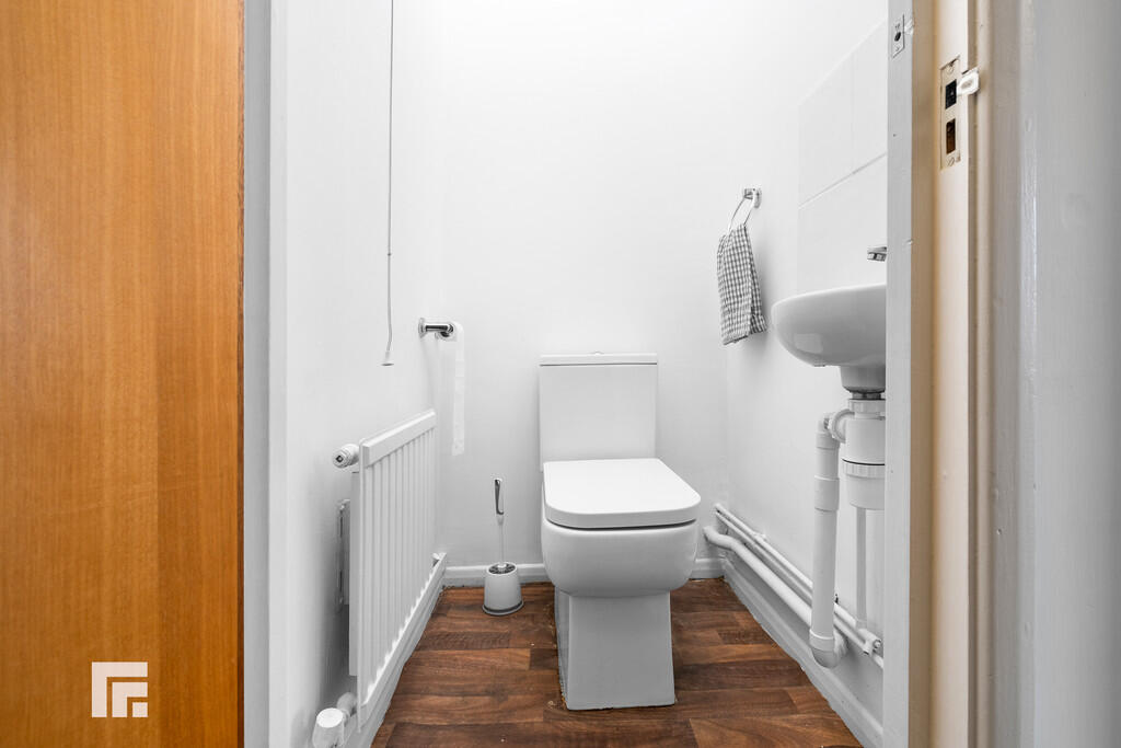W.C Wood effect vinyl flooring. W.C. Wall mounted wash hand basin with mixer tap over. Tiled splashback. Extractor fan. Radiator. Pendant light fitting.
