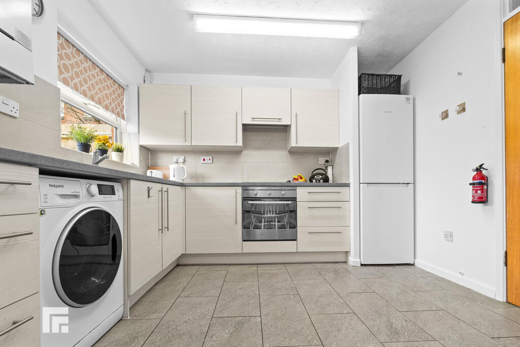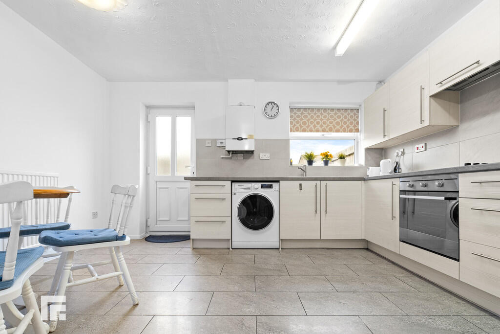KITCHEN/DINER13' 6" x 10' 3" (4.12m x 3.13m) Tiled flooring. Modern fitted kitchen with a range of wall, base and drawer units with round edged worktops over incorporating stainless steel 1.5 sink and drainer with mixer tap over and electric hob with extractor above and oven beneath. Tiled splashback. Newly fitted free standing washing machine and fridge/freezer. Strip LED light. Wall mounted 'BAXI' boiler. Double glazed uPVC window to rear aspect. Obscure glazed door leading to rear garden. Space for dining table and chairs. Power points.
