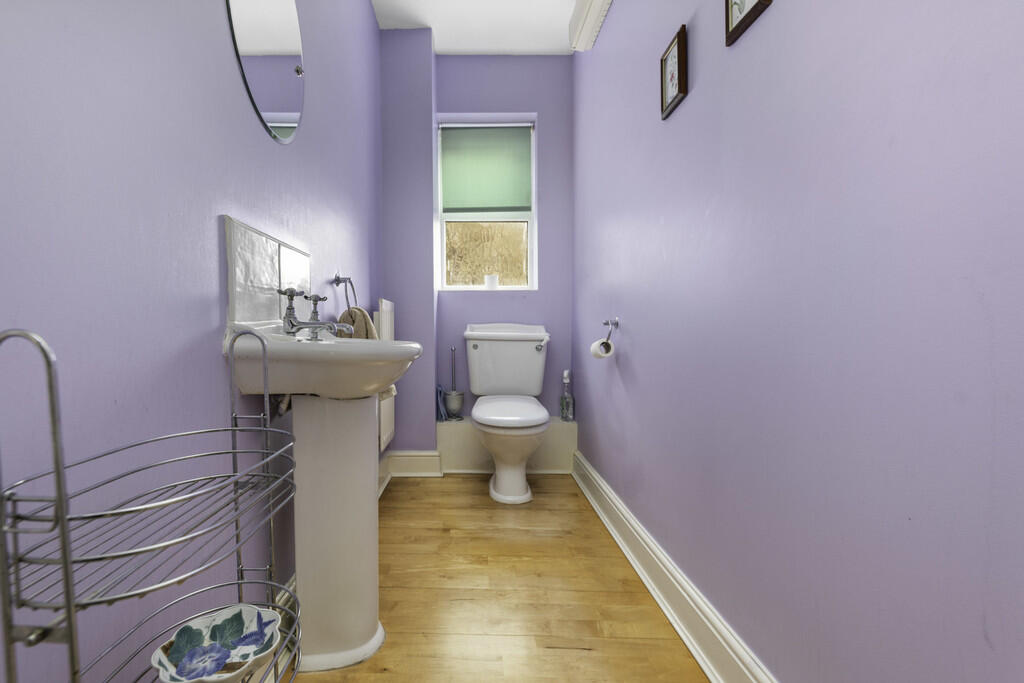 CLOAKROOM Spacious cloakroom with white suite comprising low level wc, wash hand basin. Tiled splash back. Radiator. Wood flooring.