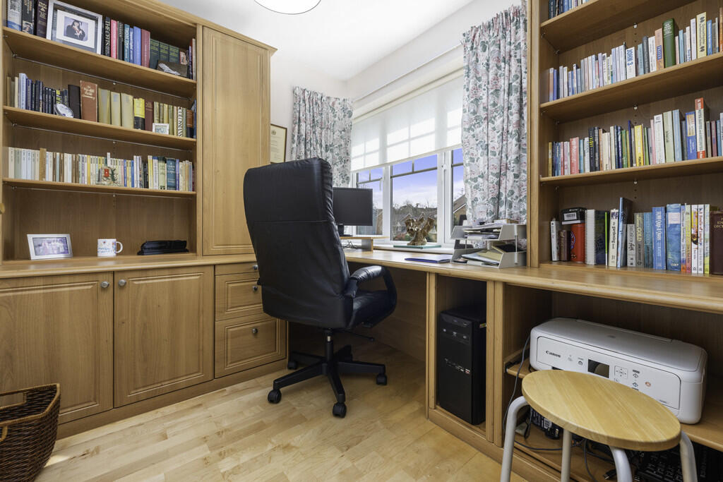 STUDY8' 1" x 7' 2" (2.48m x 2.19m) Overlooking the entrance approach. Radiator.Wood flooring. Fitted desk and shelving.