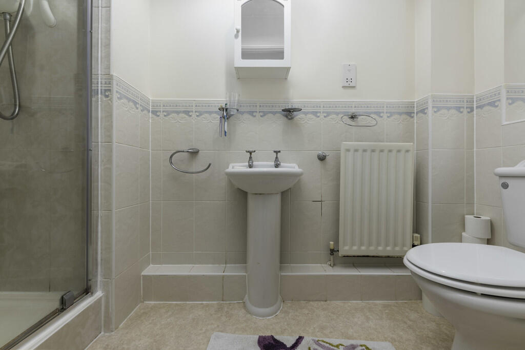 ENSUITE Quality white suite comprising low level wc, wash hand basin and shower cubicle with twin shower heads. Tiled flooring. Full wall tiling. Window to side. Chrome heated towel rail.