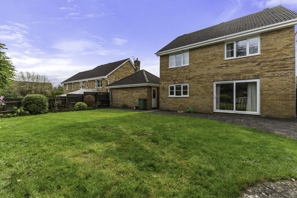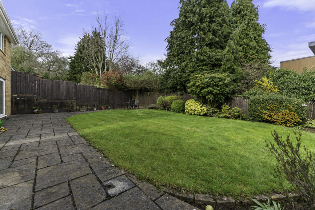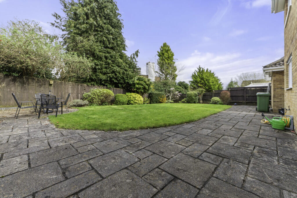 REARGARDEN A delightful south facing rear garden enjoying a beautiful paved wide patio area leading onto a well manicured area of lawn backing onto a small wooded area. Enclosed by timber fencing. Gate to side leading to front and pedestrian access to double garage. Outside tap. Outside lighting.