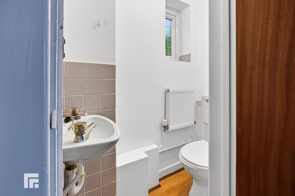 CLOAKROOM Modern white suite comprising low level wc and wash hand basin. Obscured glass window to side. Radiator.