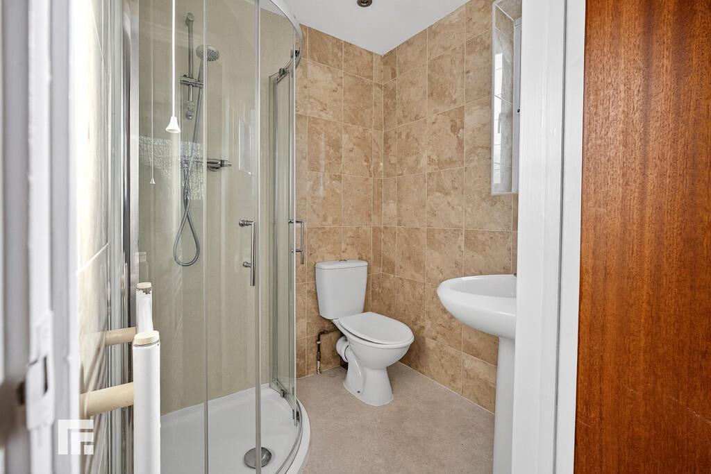 ENSUITESHOWERROOM5' 4" x 4' 9" (1.64m x 1.46m) White suite comprising low level wc, wash hand basin and corner shower cubicle. Acrylic splash back and wall tiling. Obscured glass window to side. Heated towel rail. Recessed spot lights.