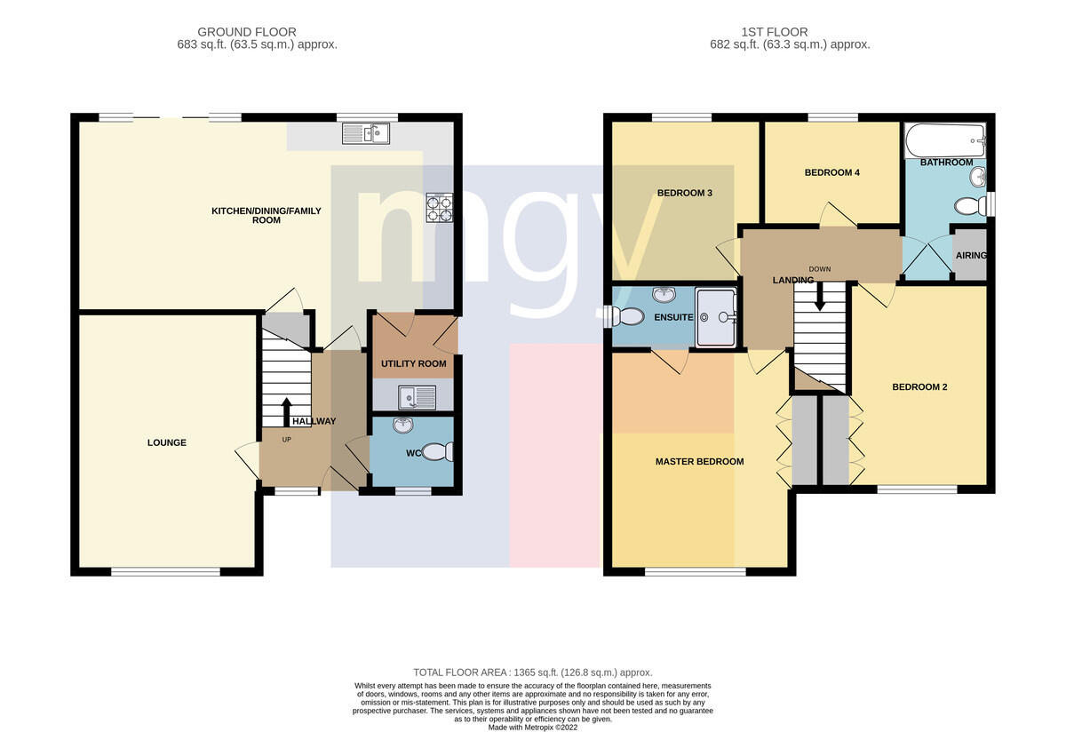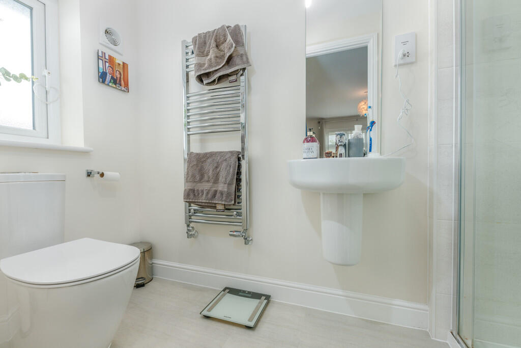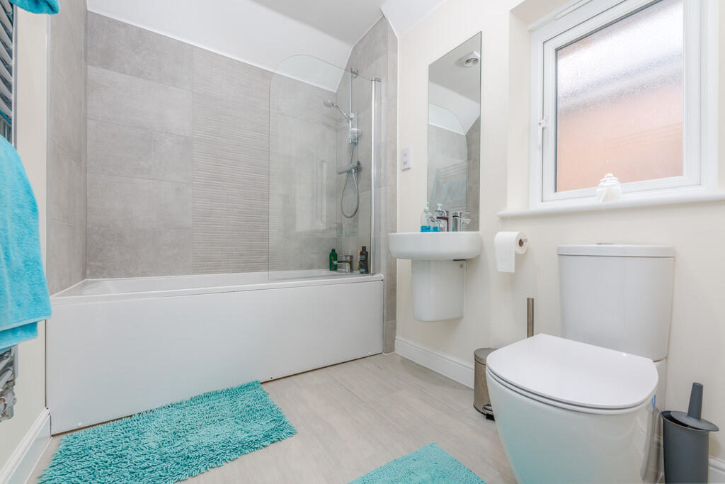 FAMILYBATHROOM10' 9" x 5' 10" (3.28m x 1.78m) Modern white suite comprising low level W.C, wash hand basin, panelled bath with shower above, swivel shower screen, wall tiling to splash back area, obscure glass window to side, electric shaver point, luxury vinyl tiled flooring, chrome heated towel rail and airing cupboard housing the hot water cylinder with shelving.