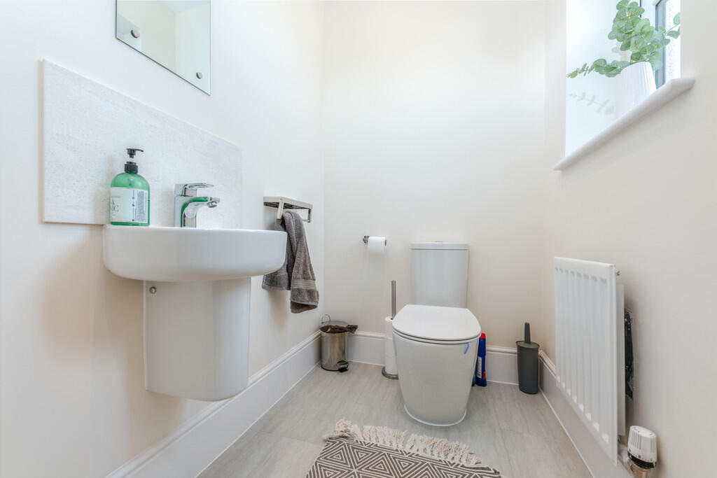 CLOAKROOM White suite comprising low level W.C, wash hand basin, tiled splashback, luxury vinyl tiled flooring and window to front.