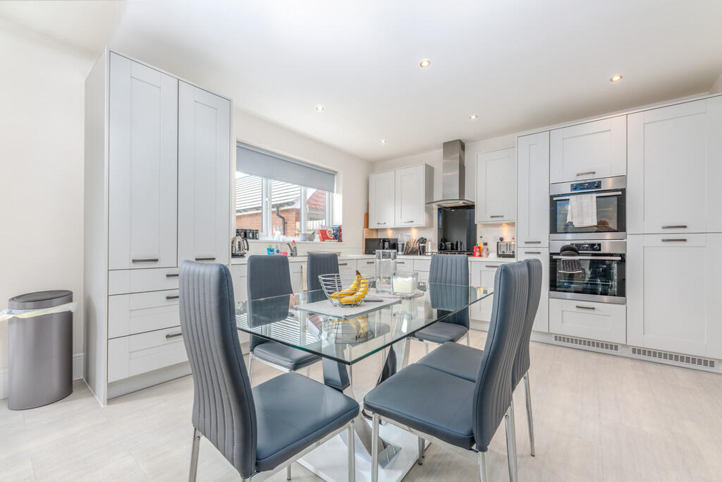 KITCHEN/DINER/FAMILYROOM25' 6" x 13' 0" (7.79m x 3.97m) Well appointed along two sides in light panelled fronts beneath worktop surfaces, inset 1.5 bowl stainless steel sink, inset four ring gas hob with curved glass cooker hood above, inset two AEG ovens, integrated dishwasher with matching front, integrated fridge/freezer with matching front, matching range of eye level wall cupboards, worktop splashback upstand, ample space for large family dining table and sofa seating area with double sliding doors leading to the delightful rear garden, luxury vinyl tiled flooring, additional windows to rear, understairs storage cupboard, two radiators and door to utility room.