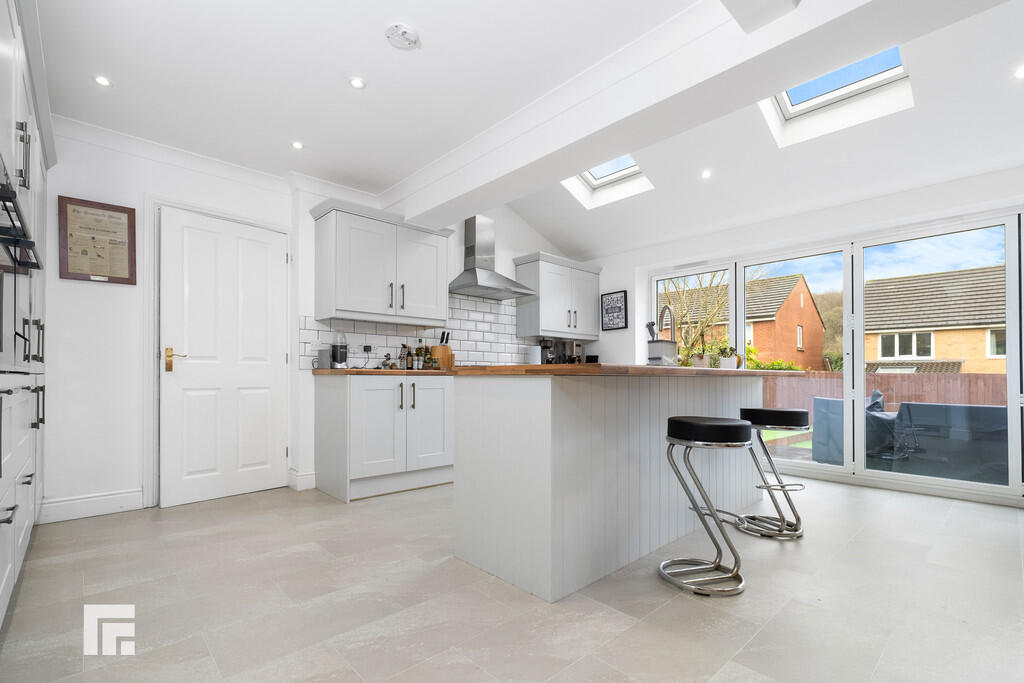 OPENPLANKITCHEN/DINING/FAMILYROOM21' 3" x 19' 7" (6.48m x 5.99m) A beautifully extended open plan kitchen/dining/family room. Appointed along two sides, a quality, light grey wren kitchen. Eye and low level cupboards beneath wood effect laminate worktops and five ring gas hob with extractor hood. Tall cupboards with integrated fridge/freezer, integrated singe oven, integrated microwave/grill with warmer draw. Island with composite sinkwith side drainer, chrome mixer tap, 'Quooker' hot water tap, integrated dishwasher and wine fridge. Additional low level cupboards. Tiled flooring. Spotlights. Three Velux windows. Bi-fold doors to rear. Door to utility room.