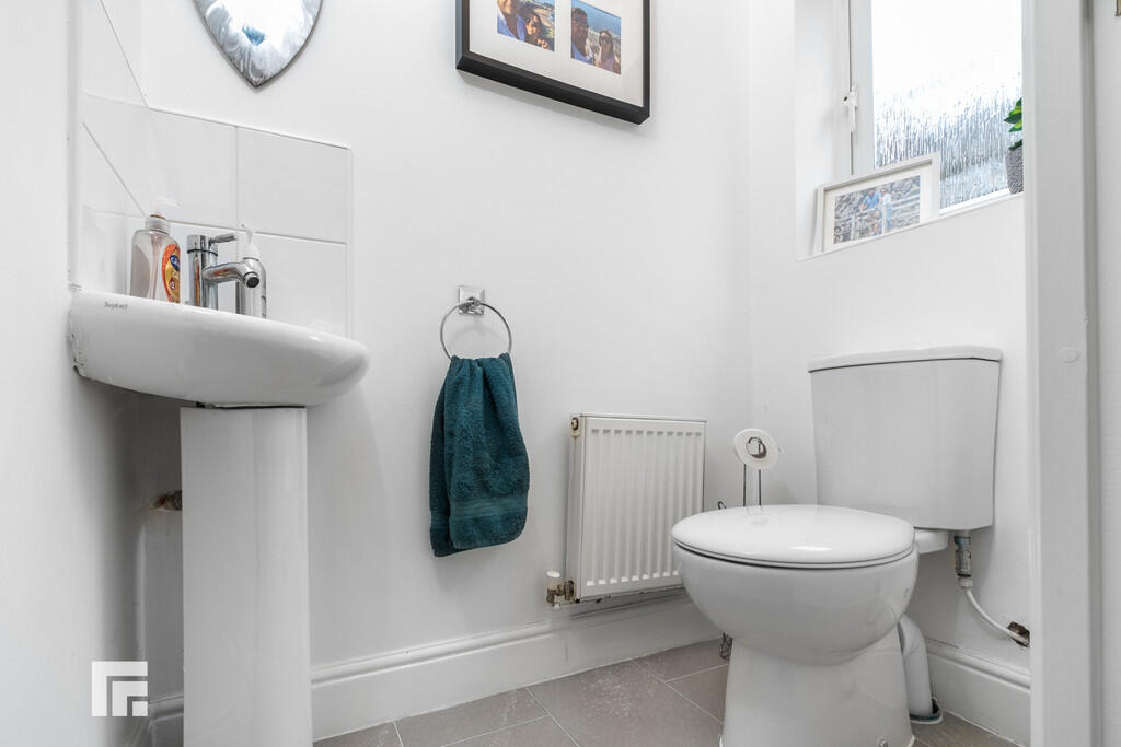 CLOAKROOM5' 0" x 2' 11" (1.53m x 0.89m) White suite; low level WC, corner wash hand basin with chrome mixer tap. Radiator. Tiled flooring. Obscured glass uPVC window to side.