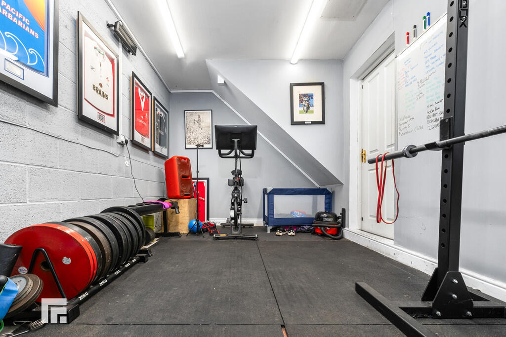 GARAGE Power and lighting. Roller shutter door. Currently being used as a gym. Door into hallway.