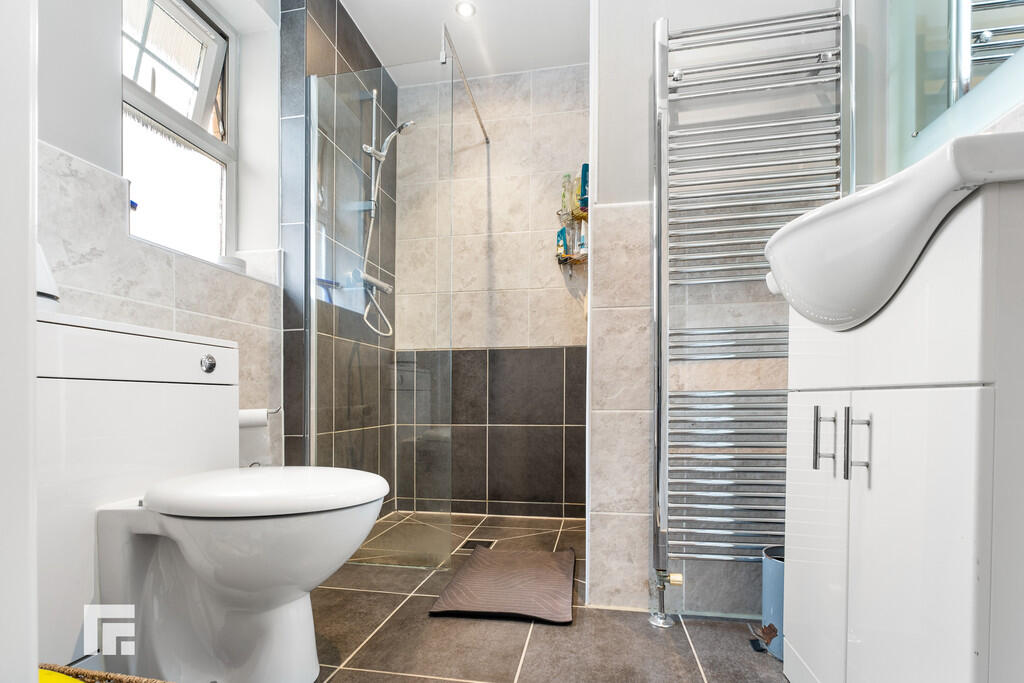 ENSUITE/WETROOM6' 7" x 6' 4" (2.03m x 1.94m) A modern, white suite; love level WC, wash hand basin with chrome mixer tap and vanity, walk in shower with chrome shower and glass screen, chrome heated towel rail and extractor fan. Shaving point. Tiled flooring and half wall tiling. Obscured glass window to front.