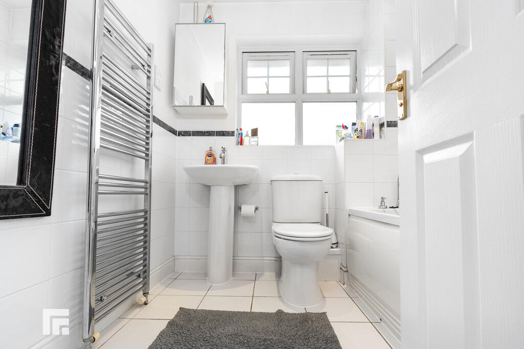 FAMILYBATHROOM6' 8" x 6' 4" (2.04m x 1.95m) White suite; low level WC, pedestal wash hand basin with chrome mixer tap, bath with chrome mixer tap, chrome shower and glass screen. Extractor fan. Spotlights. Chrome heated towel rail. Shaving point. Tiled flooring. Half wall tiling. Obscured glass window to rear.