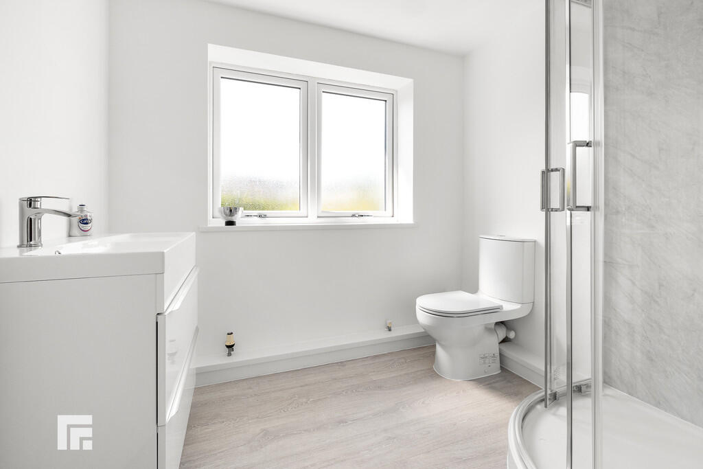 ENSUITE A newly fitted white en-suite comprising of low level wc, ceramic wash hand basin with storage below, panelled corner shower cubicle. Quality laminate flooring. Obscured glass window to rear.