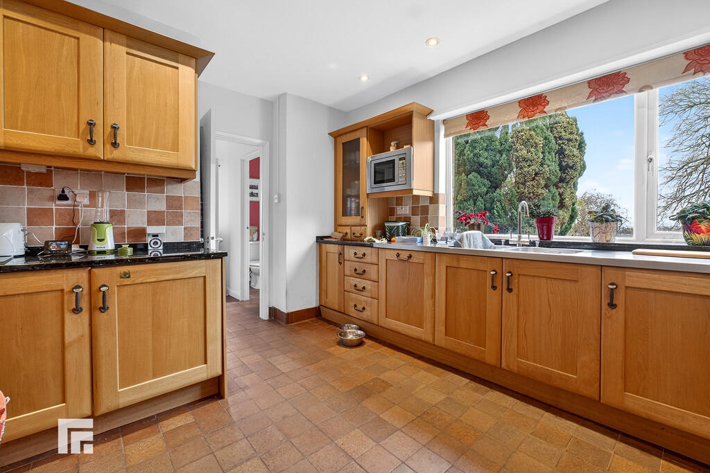 KITCHEN12' 2" x 11' 8" (3.73m x 3.56m) Appointed along four sides in wood panelled fronts beneath granite worktop surfaces. Inset two bowl sink with stainless steel dish washing areas to either side. Space for range style cooker. Integrated microwave. Tiled splash back. Tiled flooring. Window to rear. Radiator. Doors to inner lobby and dining room.