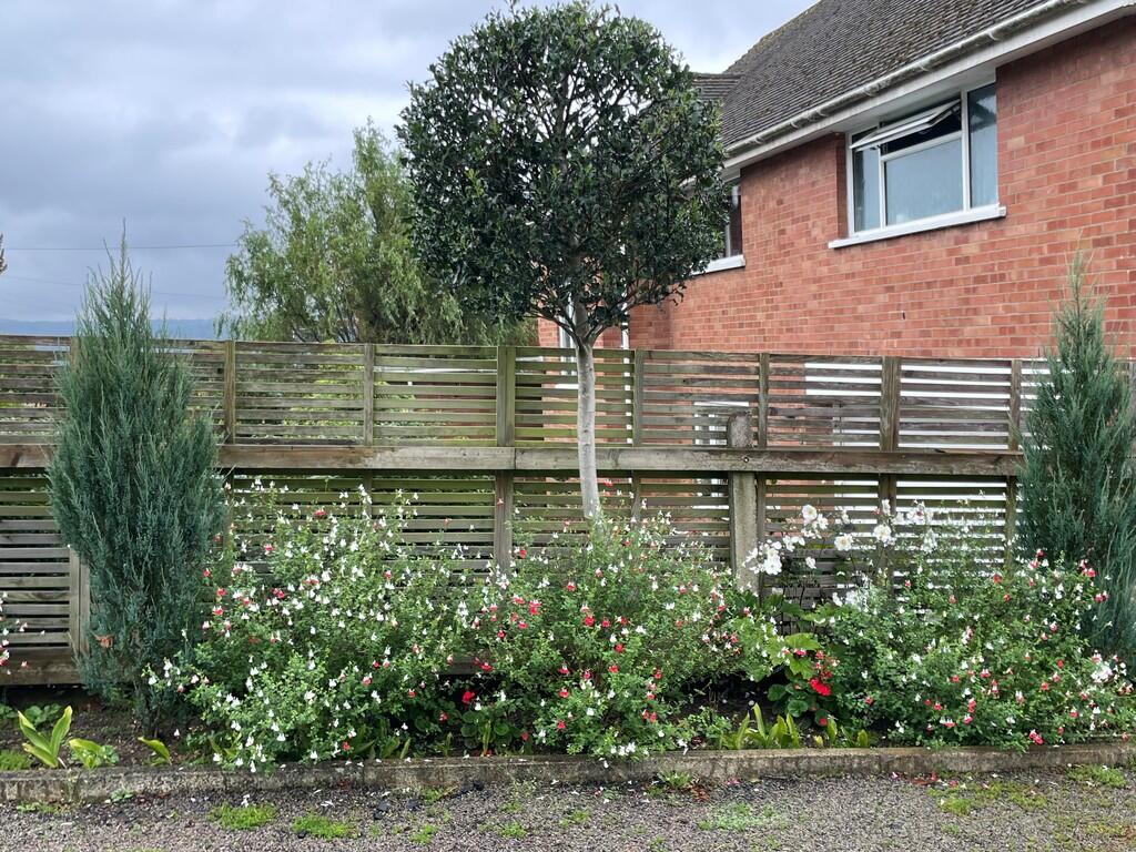 FRONTGARDEN With large in and out driveway. Neat beds of plants and shrubs. Wide paved pathways. Gates to either sides. Outside power point. Outside light.